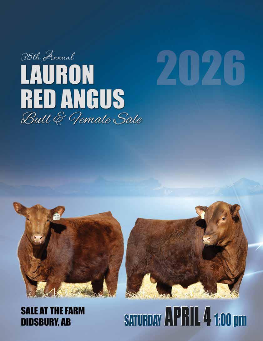 Once again, we are having a video sale at the farm, bulls will be displayed outside the sale barn. Visit with us anytime prior to sale day to tour the pens or cow herd, or contact sales management to help with your bull/female purchasing needs. Check out the videos closer to sale day on DLMS or our website www. lauronredangus.com . Directions to the farm are 5 miles east of the Didsbury overpass on Highway 582, north side of the road. Bulls can remain at the farm free of charge until May 1, any animals staying must be insured and Cheryl Brown with Stockman’s Insurance will be available sale day. If you choose to take your purchases home sale day or within a week of the sale, receive $100 per lot off purchase price. Delivery can be arranged and will commence 2 weeks after the sale so please leave complete instructions at the settle up desk at the conclusion of the sale.