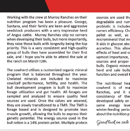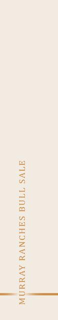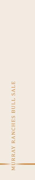 At its core, Murray Ranches is a family operation built on integrity, work ethic, and a genuine desire to see their customers succeed. ey are committed to breeding high-quality purebred Angus cattle and understand the role strong, predictable genetics play in improving cow herds and bottom lines alike. We encourage you to make plans to visit the ranch and evaluate this set of bulls in person. You will nd quality and value throughout the o ering, with bulls that can t a wide range of programs and budgets. If you are unable to attend on sale day, feel free to contact the Murray family or any member of the sales sta and they will be happy to assist you in a professional and straightforward manner. We look forward to visiting with you on sale day and sharing in what is shaping up to be an exciting next chapter for a program with a very bright future. e bulls will be impressive, and the hospitality will be second to none from a family fully committed to your success.