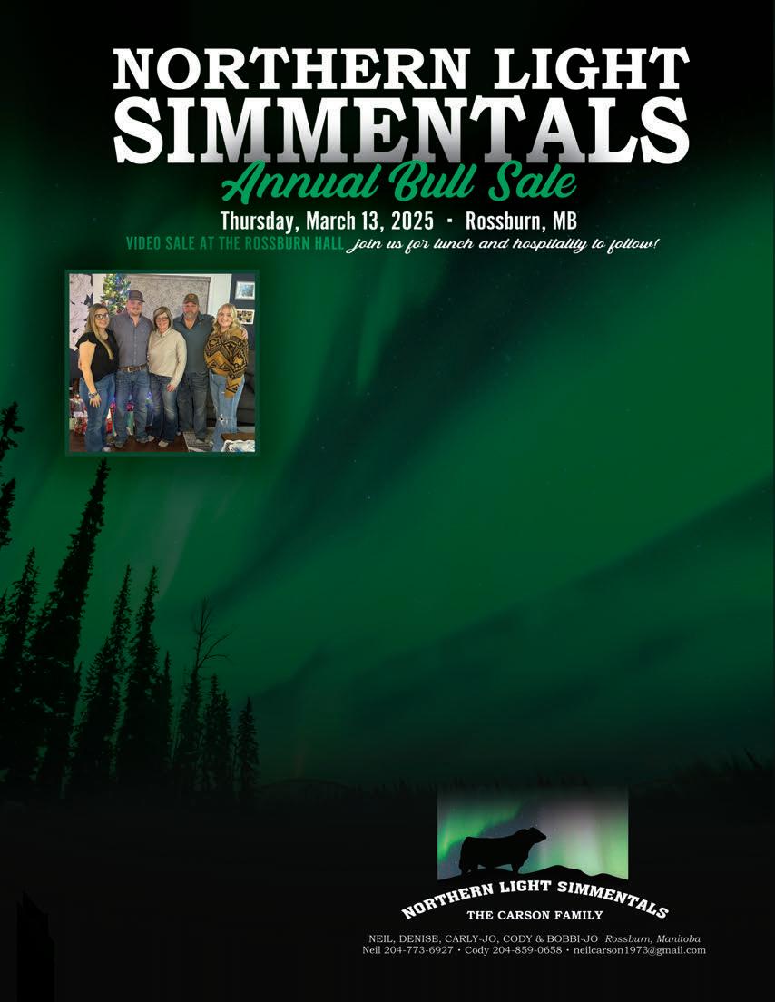Welcome to the 2025 Northern Light Bull Sale! The Carson family are some of the really good people and breeders in the industry and are a quality source for Simmental genetics. They have a strict breeding philosophy of producing sound structured, sure footed, easy doing cattle that can thrive in our harsh at times prairie conditions. We wish to extend an invitation to producers from near and far to join us near Rossburn, MB for this great event.