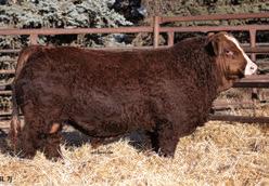 Another favorite of mine! A very dark red bull with a great haircoat. He is very stout, thick and has good depth of body and a nice thick quarter. His dam is a nice red blaze cow with a nice udder. Being born from a first calf heifer with a low 84 lb birth weight we believe this guy should calve well and add thickness and that very special dark red color!