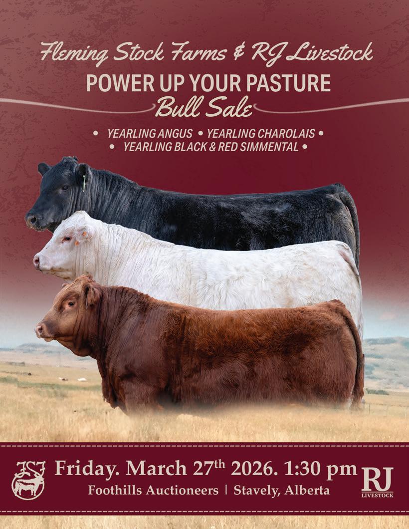 Thank you for taking the time to view our catalog and the bulls on ofer from Fleming Stock Farms & RJ Livestock. We are very pleased with this year’s ofering of yearling Black Angus, Simmental and Charolais bulls. The bulls are being developed at Duncan & Cecilie’s place, 1/2 mile west of the Granum junction of Highways #2 & #519. We encourage and welcome you to stop by any time prior to the sale to preview the bulls.