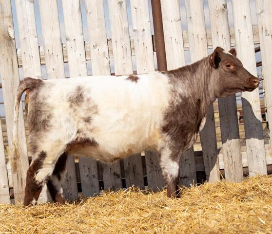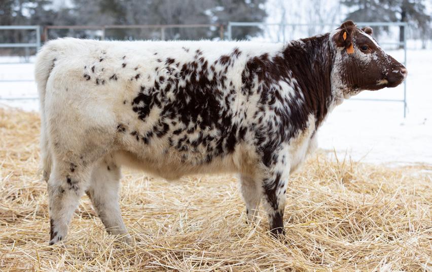 Soft Creek Navada 1N is a long bodied, smooth sided heifer, that really carries herself powerfully in her back end. Her dam is a deep-bodied broody cow from our commercial herd carrying a 4-way cross (Speckle Park, Angus, Hereford, Charolais). Building on this hybrid vigour with a shorthorn pairing was a no brainer and we couldn’t be more pleased with the results. Registered shorthorn plus 50%.