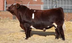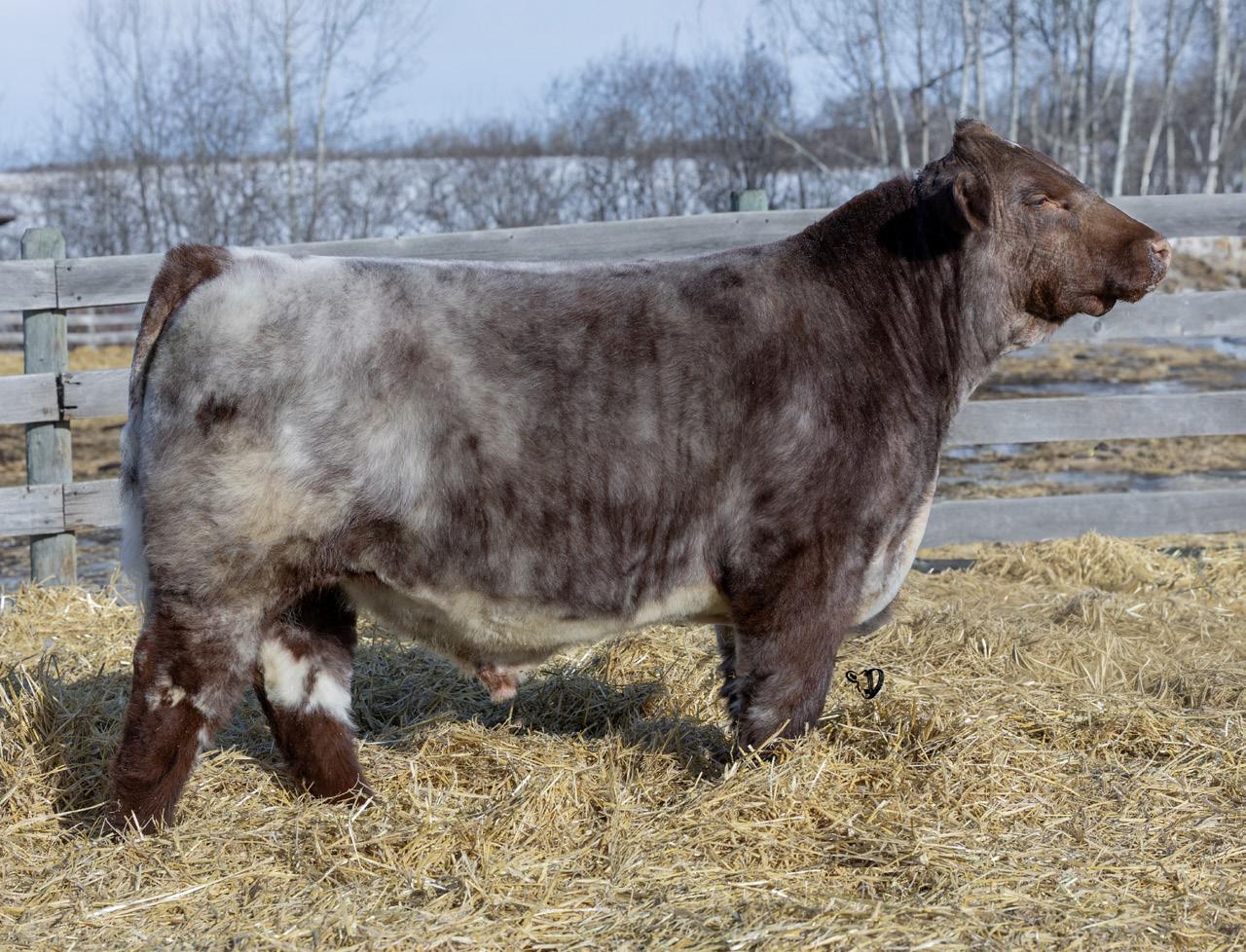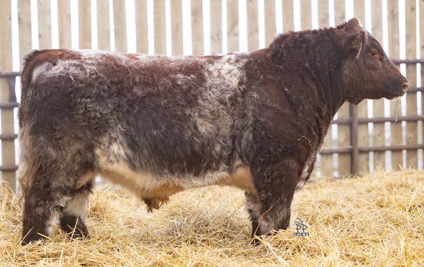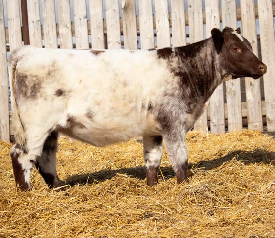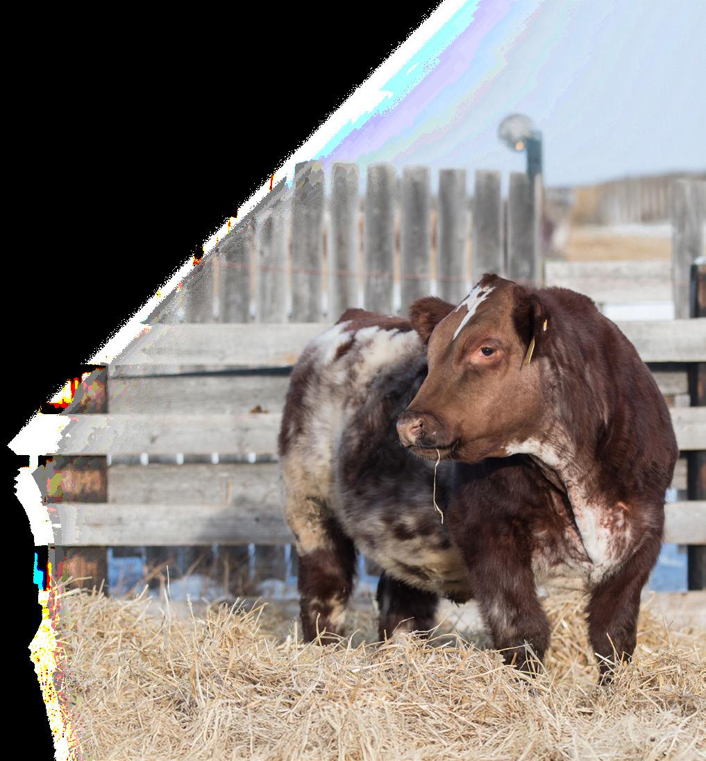 50% by color. 75% by pedigree. 100% quality. 22N is a Manhattan son we are excited to watch mature. Benicio’s maternal grandmother is Rosa 2A, and she is in a lot of our pedigrees for the right reasons. This bull offers a great level of muscle expression, depth of body and stoutness. He combines deep rib shape with added frame and length of extension resulting in a high performing, product driven type bull. He stands proud on a wide base with great feet and leg structure, and big square nuts. Put this Lad with a group of white cows or a group of Shorthorn momma’s, he will work either way.