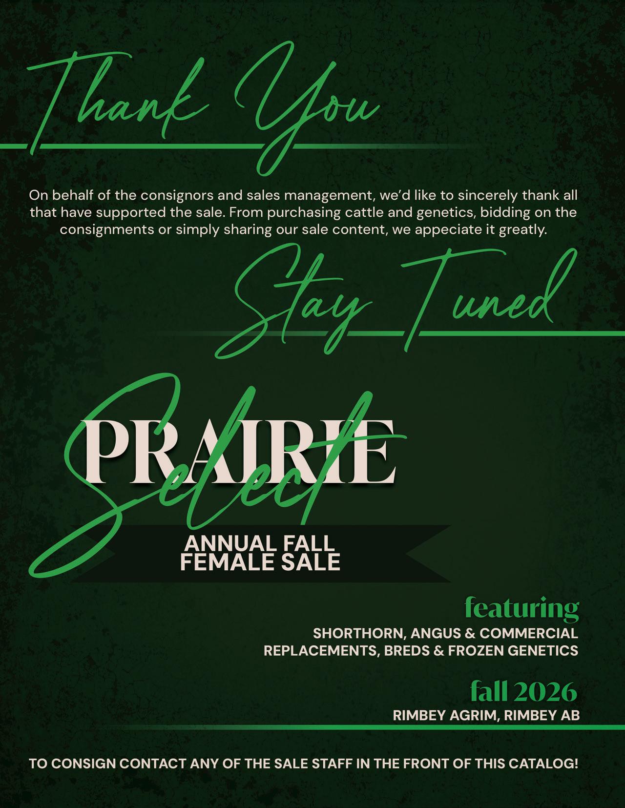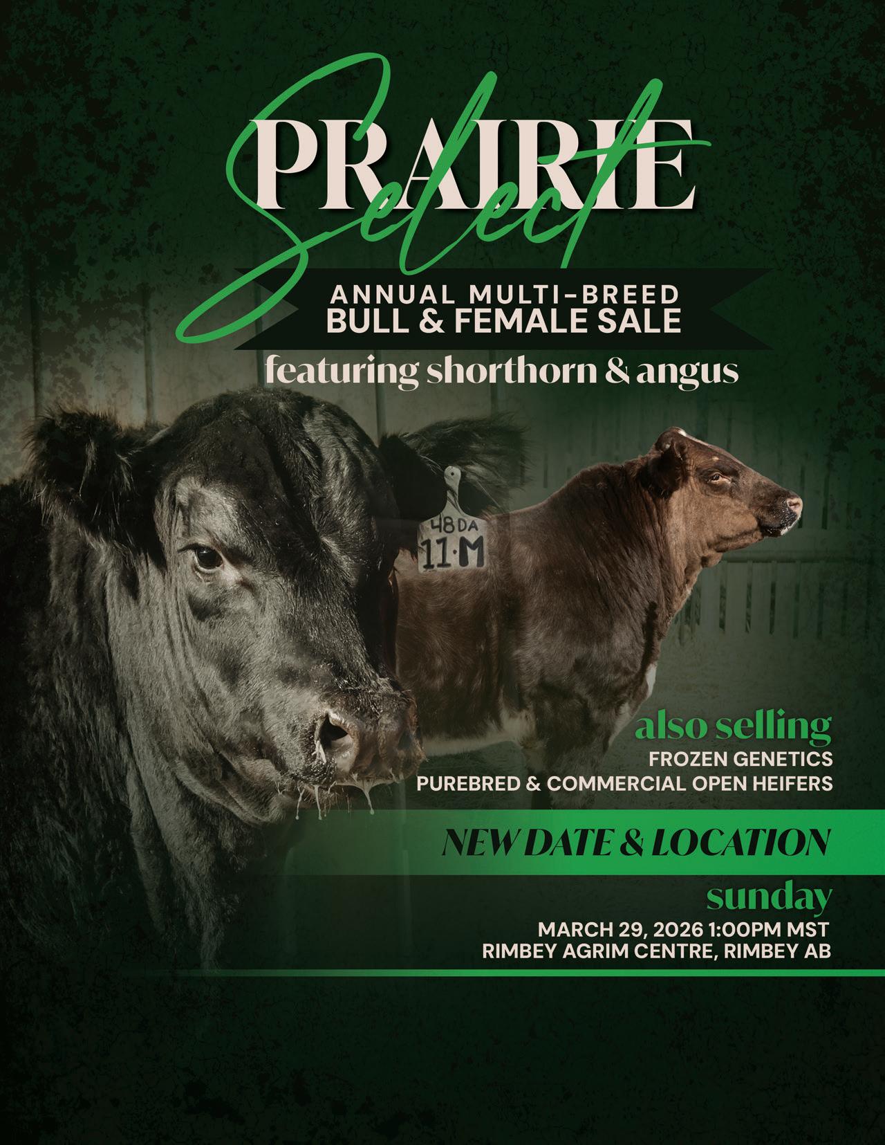 Prairie Select 2026….new date, new location. But what hasn’t changed is the excitement of being in the Beef Industry, along with the quality of bulls we are presenting at this year’s sale. We saw record setting calf prices last fall and all indications are even stronger prices for Fall 2027 with a prediction of record setting commercial bred heifers. Now, more than ever, it is imperative to invest in a bull that will increase your bottom line, come weaning and leave a strong set of replacement females.
