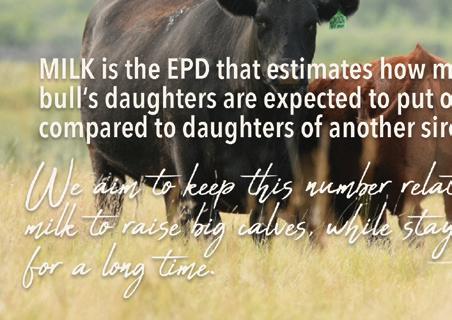 Mastadon 4M o ers a combination of calving ease and early growth giving him the opportunity to work in di erent programs. He came easy at birth and then pushed forward with the kind of early growth that adds additional fall pay weight on a set of calves. His mother is the type of female that combines a youthful udder as she ages and the structural soundness that points to cowherd longevity. ere’s enough balance here in maternal value and growth to retain daughters without sacri cing weaning performance.