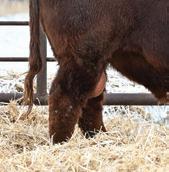 Motley Crue 999M brings added dimension and presence into the group. He shows early development that o en translates into extra weight by weaning. He comes with outcross potential being out of a moderate wedge shaped black red carrier dam who herself is very tidy in her udder and teat design. We would recommend keeping his daughters as they have a great amount of potential for superior foot quality, adaptability to di erent environments and the sense to raise heavy payweight calves while still holding together well and looking good doing it.