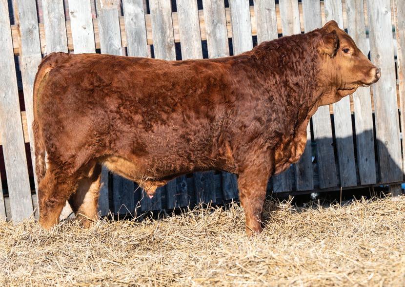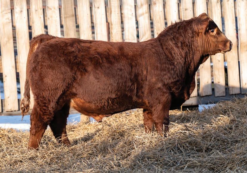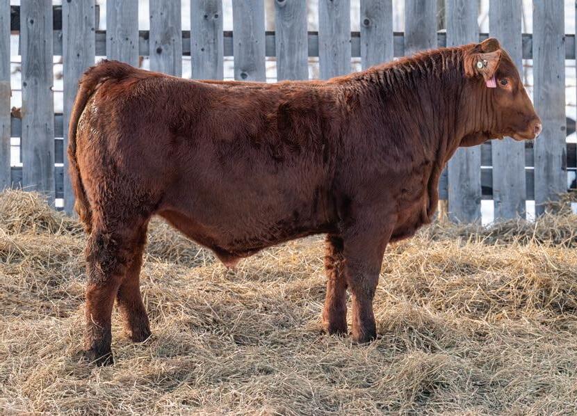 Nashville is a dark red bull that will calve like a dream. Mothered by one of our coveted Gold Key daughters, she has done excellent job on this March calf. She had a set of twins as a heifer that set her 2025 calving date back a little but she is due to calve in January 2026. Nashville impressed some visitors on summer tours and has exceeded our expectations for such a young age. I would keep this guy on your short list if you are in the market for a dark red calving ease specialist. I would plan to retain his daughters as well. HOMO
