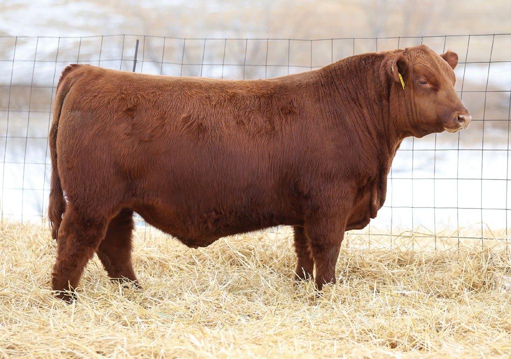 Cold Open is a solid made, beef bull in the darkest shade of red. He sold through our 2023 bull sale to Handhills Farming. His calves have his eye catching color, impressive muscle shape and are pen favorites. His dam Patsy 947E is an Elite Dam which adds to his worth.