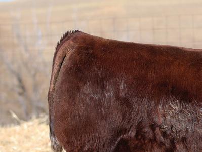 Donor dam, Frado 74D is a CAA Elite female who injects her dinner plate feet and dark red color into all her calves. Her daughters have been past Genetic Focus Sale features being selected by Voge Cattle Company and Hanold Cattle.