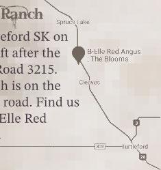 14km north of Turtleford SK on Highway 26. First left after the bridge onto Range Road 3215. 1km south, the ranch is on the left hand side of the road. Find us on Google Maps: B-Elle Red Angus; The Blooms.
