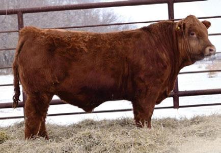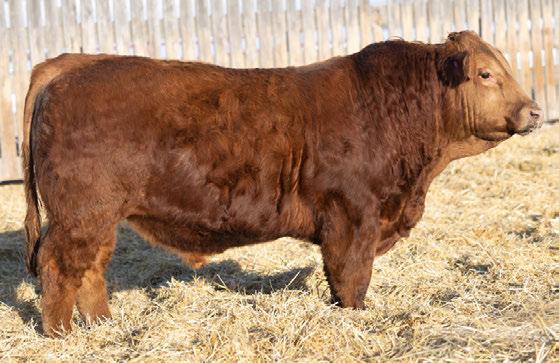 — A larger framed red bull with good muscle expression but carries it very smoothly — Both sire and dam are dark red, very good chance he will be Homo red — Ranks top 25% for MCE