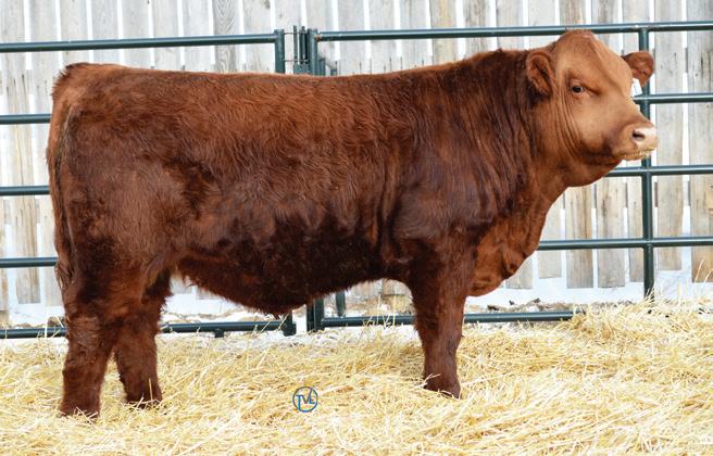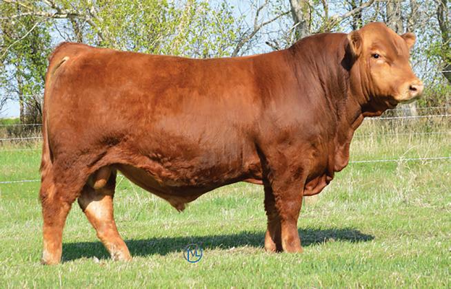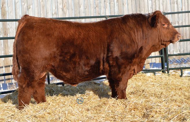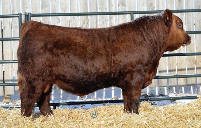 AWB Twin View Two Socks 49N is easy to find with his liver red colour and is a carbon copy of his daddy. We can’t say enough about our excitement in Dunbar. His first daughters averaged about $11,000 last fall and we think he’s just getting warmed up. Two Socks was mothered by a moderate, tanky made Vendetta daughter with small teats and superb udder attachment. She had her second calf here this spring and shows so much potential. She comes from the Gabby cow family ~ shout out to the Bonchuk legend! Moderate at birth, Two Socks ranked in the top half at both weaning and yearling. He’s another bull who’s truly designed to leave rock solid daughters without compromising pay weight in the steer pen.
