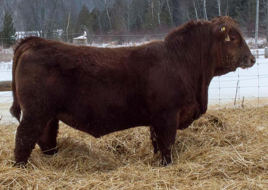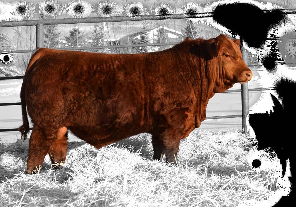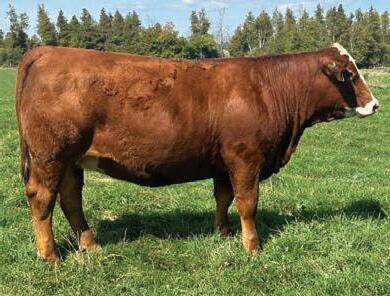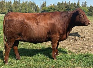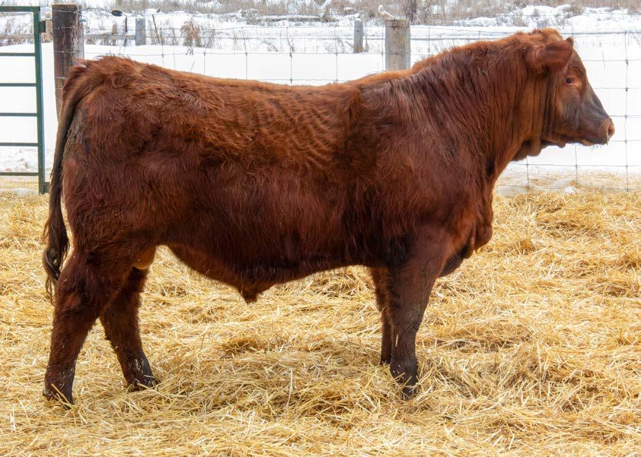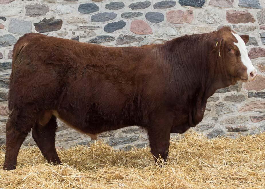 Baldie alert with that blood red hide. His sire, Springcreek Eastwood 60G was purchased in 2020 from SPRING CREEK SIMMENTALS for $16,000. Multiple daughters sold in the prime bred heifer sale last fall that set records for commercial females in Canada. He has been the definition of calving ease with performance, who also lays down females with drool-worthy udders. 111’s dam 88D is a loose hided baldie with a little more frame and a perfect set of feet and a gorgeous udder. Highly marketable, heavy milking daughters is what to expect from 111N