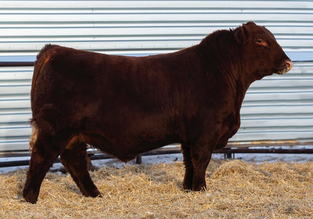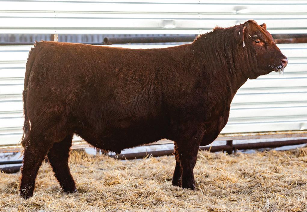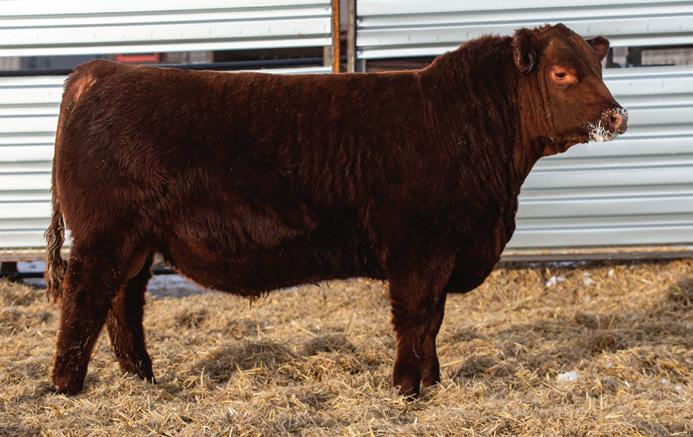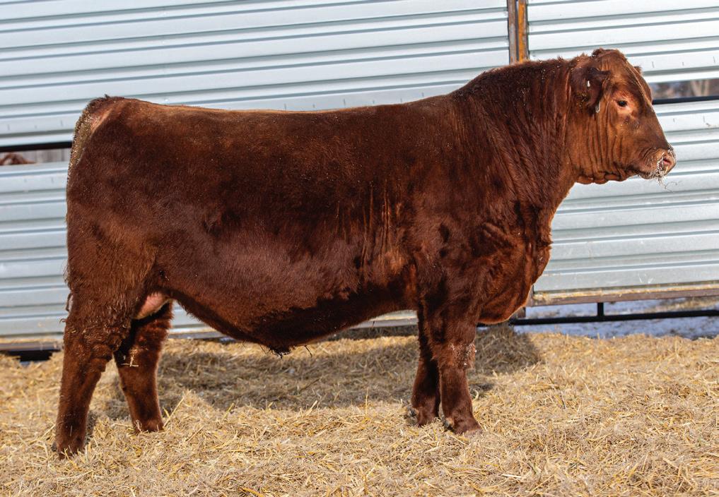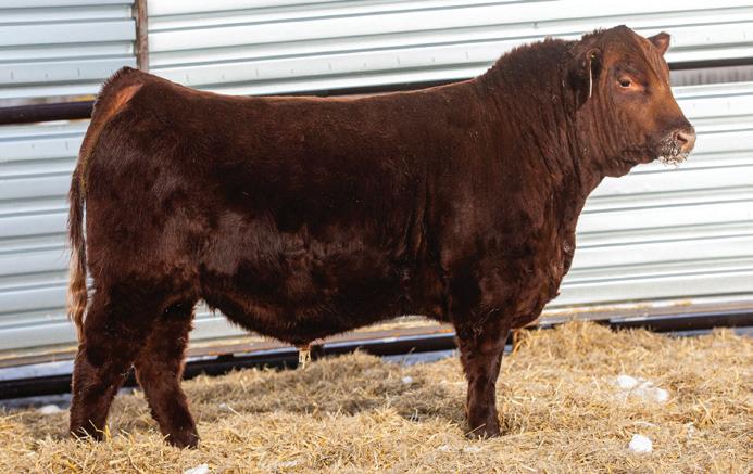 526 is a blood red, muscular, calving ease option among his contemporaries. 526’s build and muscle shape is impeccable. 526’s young dam is ultra e cient, fertile and great looking. 2025 was a tremendously dry year and if you want to add maternal value to your cow herd with extra do-ability, this young cow nailed it.