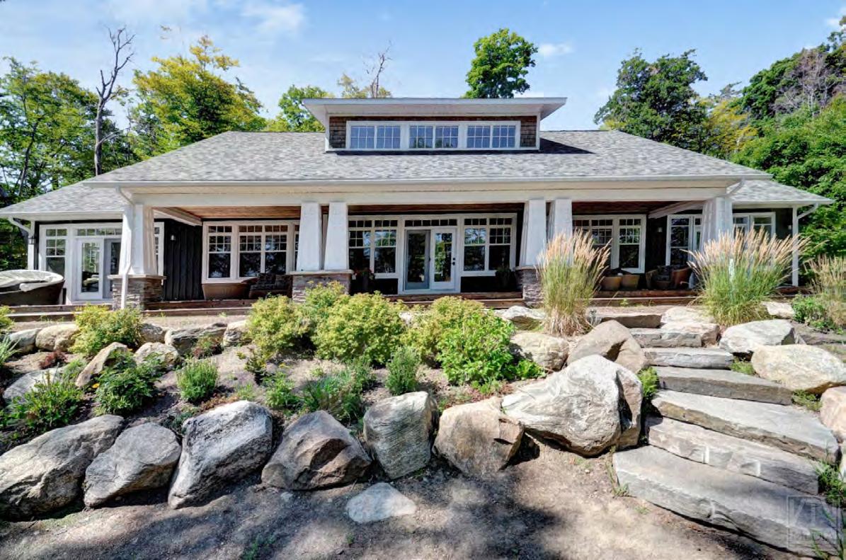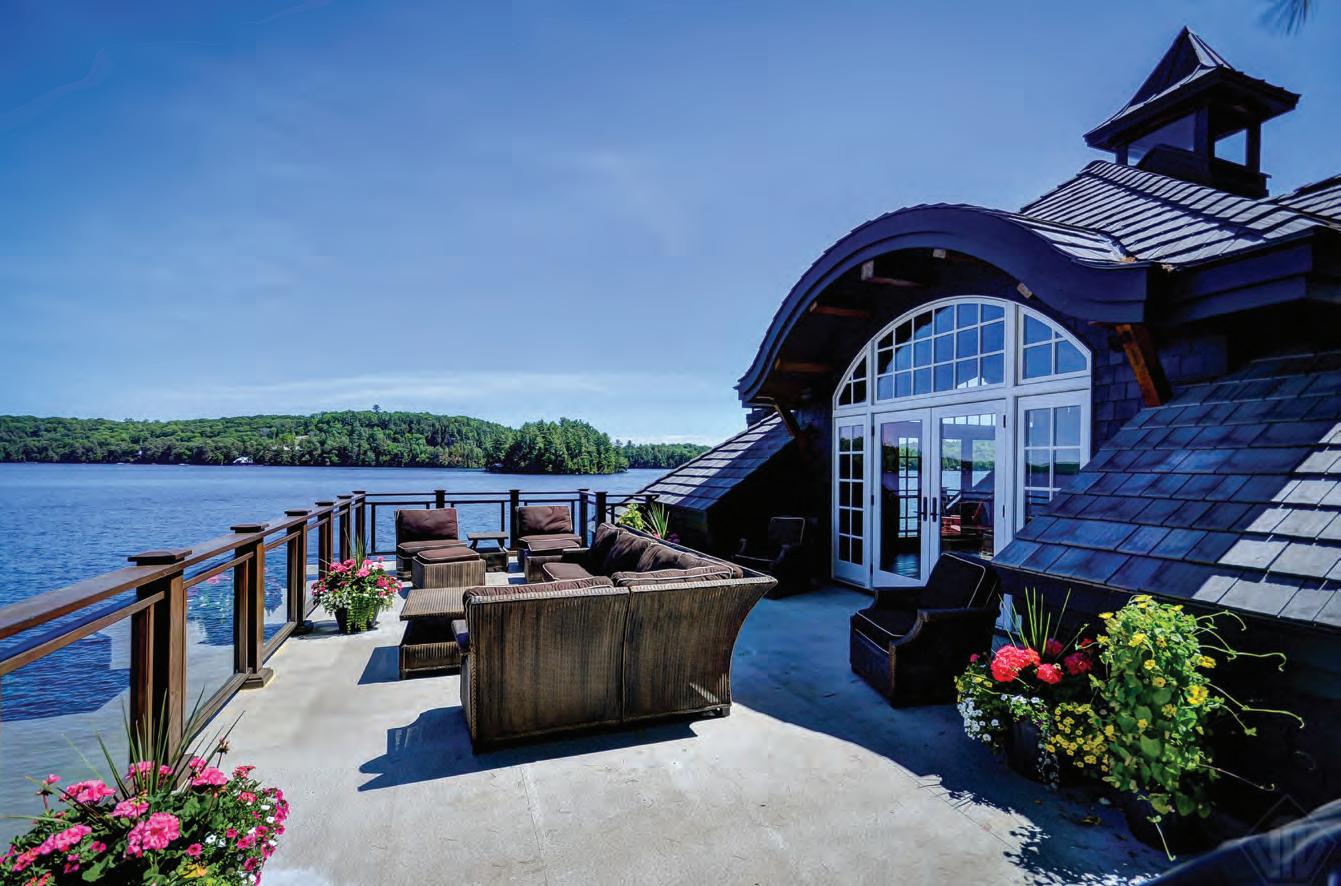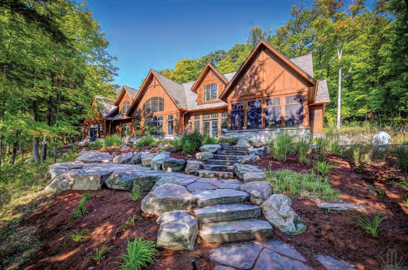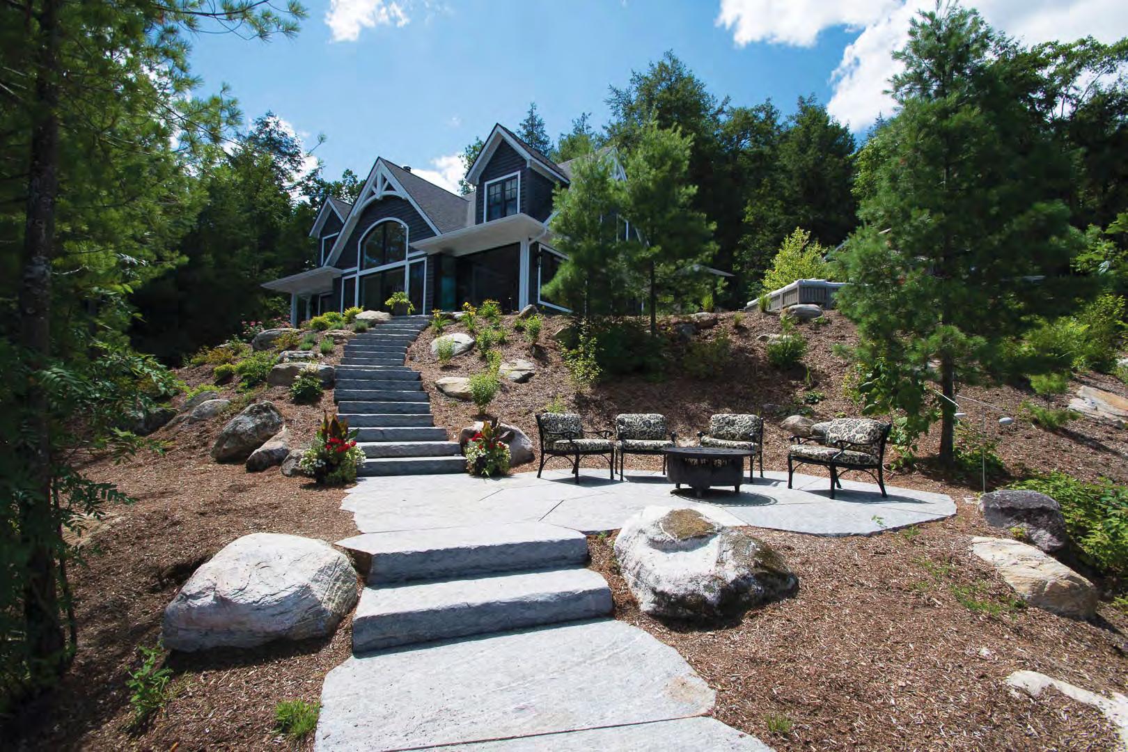 As you approach from the (newly graded, and now quite navigable) entry road, a new garage-cumstorage shed matches the charcoaland-white trim of the main cottage; it’s big enough for offseason items such as canoes and Jet-Skis in winter, and skis and snowmobiles in summer. Up a flight of stone steps to the top of the hill, there’s that wide-open view; set before it on a slight angle, the cottage looks almost modest, with its dark walls, steep roofs and white trim.