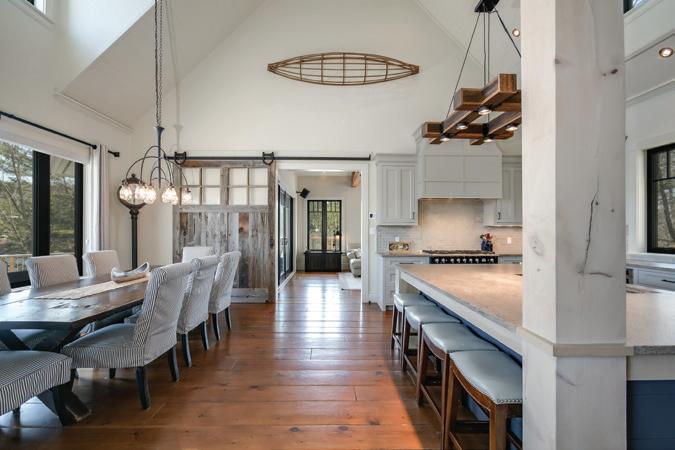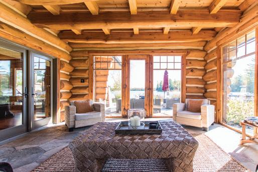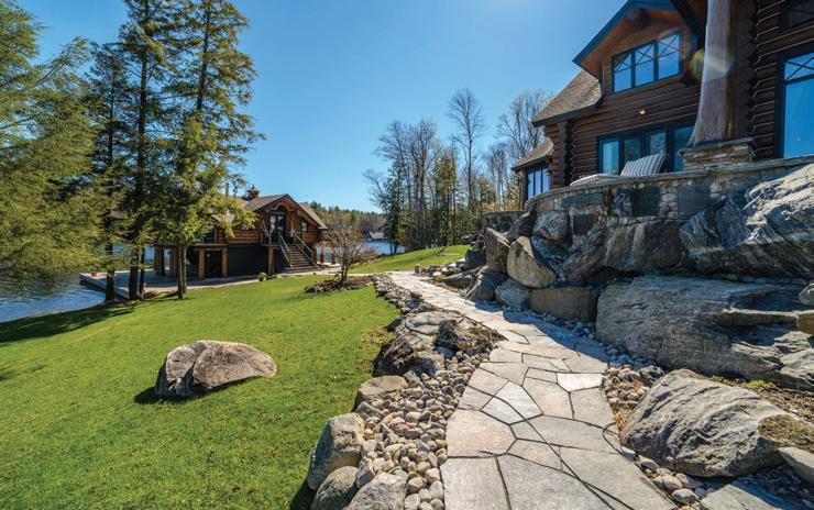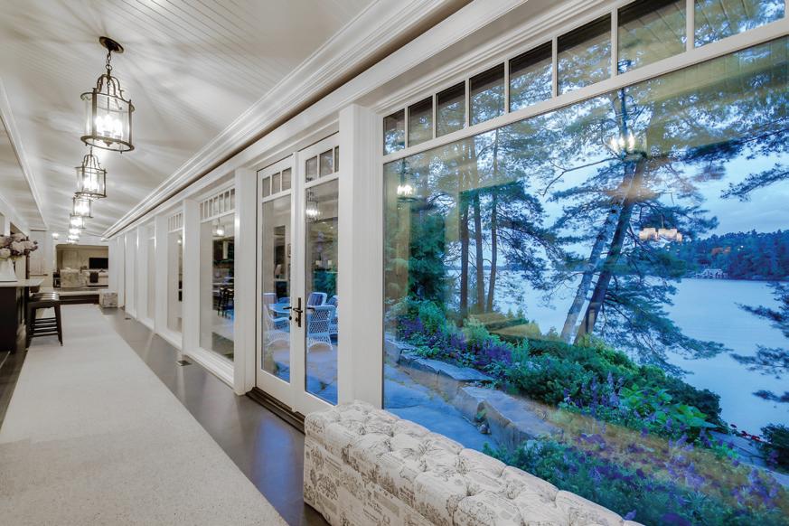From the patio, it’s a short walk down the beautifully landscaped granite steps to the truly stunning Muskokastyle boathouse featuring two boat slips, a fully appointed dock level kitchen and two-piece bathroom. The upper level offers a guest suite with full washroom and two balconies. Relax in comfort and style on the sun-drenched dock under ten-foot-wide umbrellas, or take in the stunning fall colours of Lake Rosseau from the upper-level balcony featuring automatic screen.
