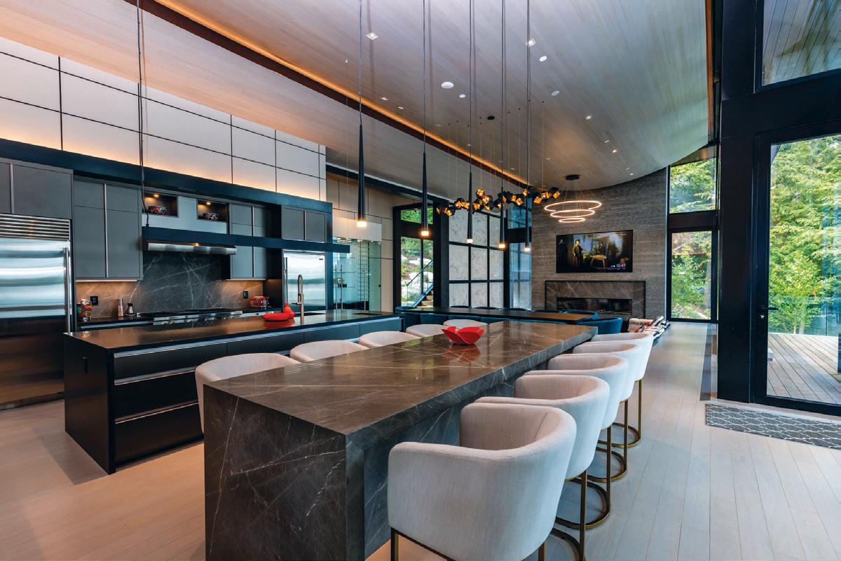 Inside or out, the view takes centre stage – whether you’re cooking dinner in the modern chef’s kitchen, enjoying a meal in the dining area with its unique live-edge table, or relaxing in the living room with its contemporary stone fireplace. The full southwestfacing exposure means you’ll enjoy full sun throughout a leisurely day, and unforgettable sunsets night after night.