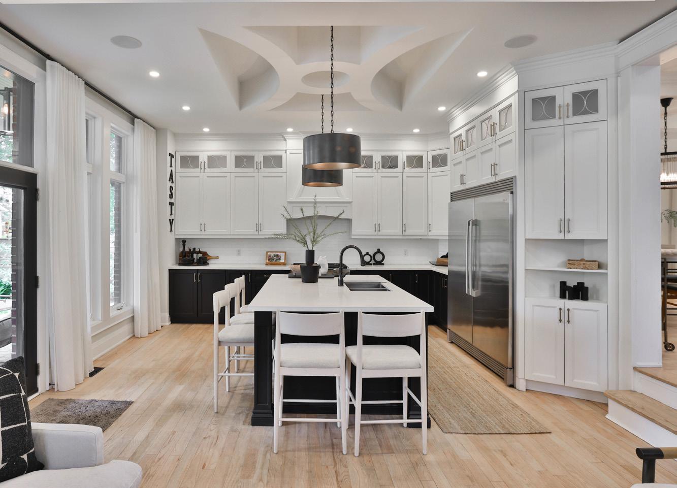 A paneled home office, dual powder rooms, and a prep-grade laundry suite round out the main floor. Every corner, every angle has been shaped with intention.