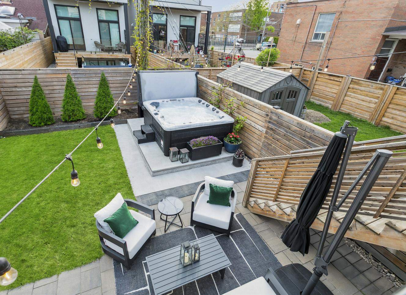 The backyard is where the home truly takes on a life of its own. Professionally landscaped to balance structure with softness, the grounds unfold in curated layers. A saltwater pool is framed by a custom hot tub and cooling tub, all set in natural stone. A skylit terrace offers dining space beneath the canopy, while a glass-roofed gazebo allows for quiet conversation long after the sun has set. The lighting is subtle, purposeful. Irrigation is automated across 20 zones. Every inch of the exterior feels like an extension of the architecture.