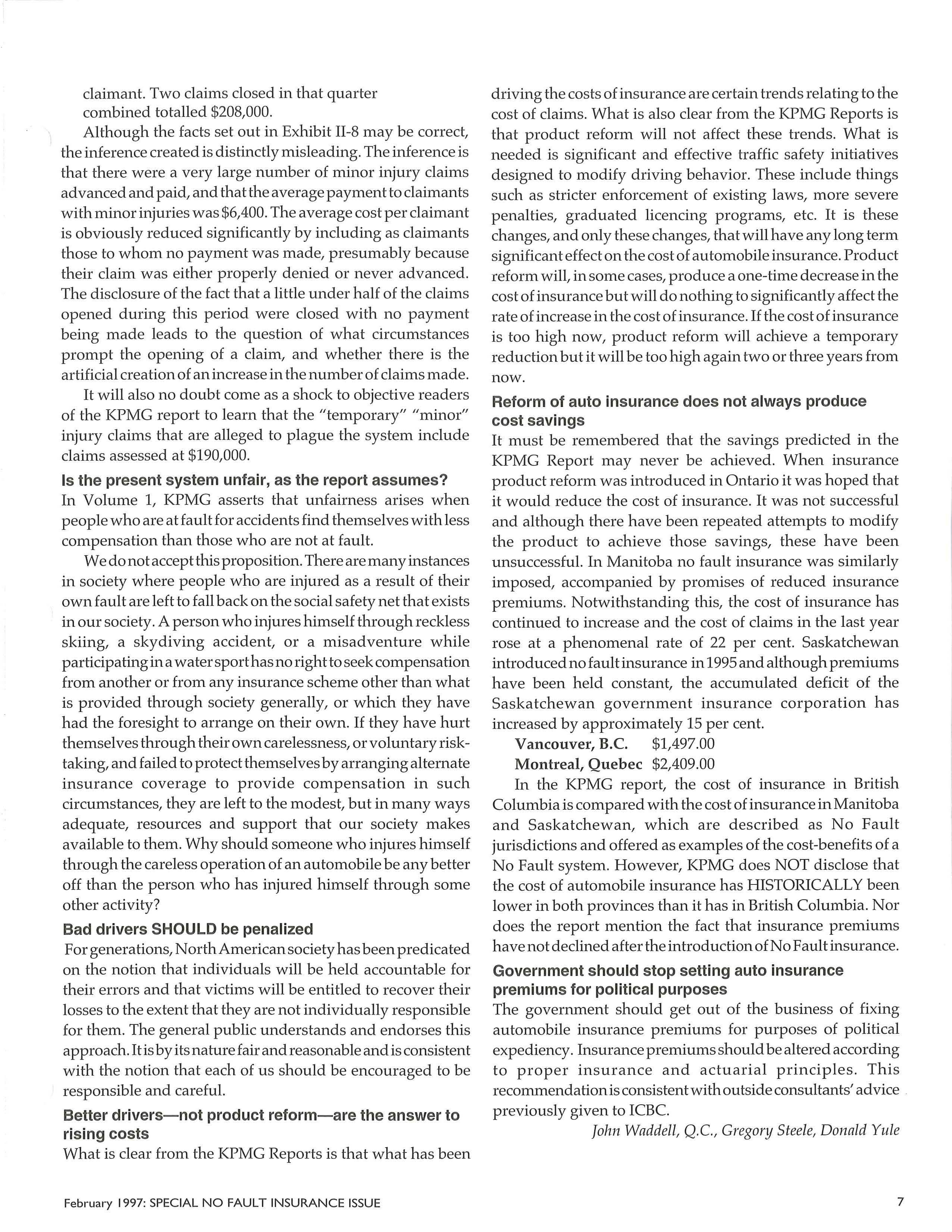 In the KPMG report, the cost of insurance in British Columbia is compared with the cost of insurance in Manitoba and Saskatchewan, which are described as No Fault jurisdictions and offered as examples of the cost-benefits of a No Fault system. However, KPMG does NOT disclose that the cost of automobile insurance has HISTORICALLY been lower in both provinces than it has in British Columbia . Nor does the report mention the fact that insurance premiums have not declined after the introduction of No Fault insurance.