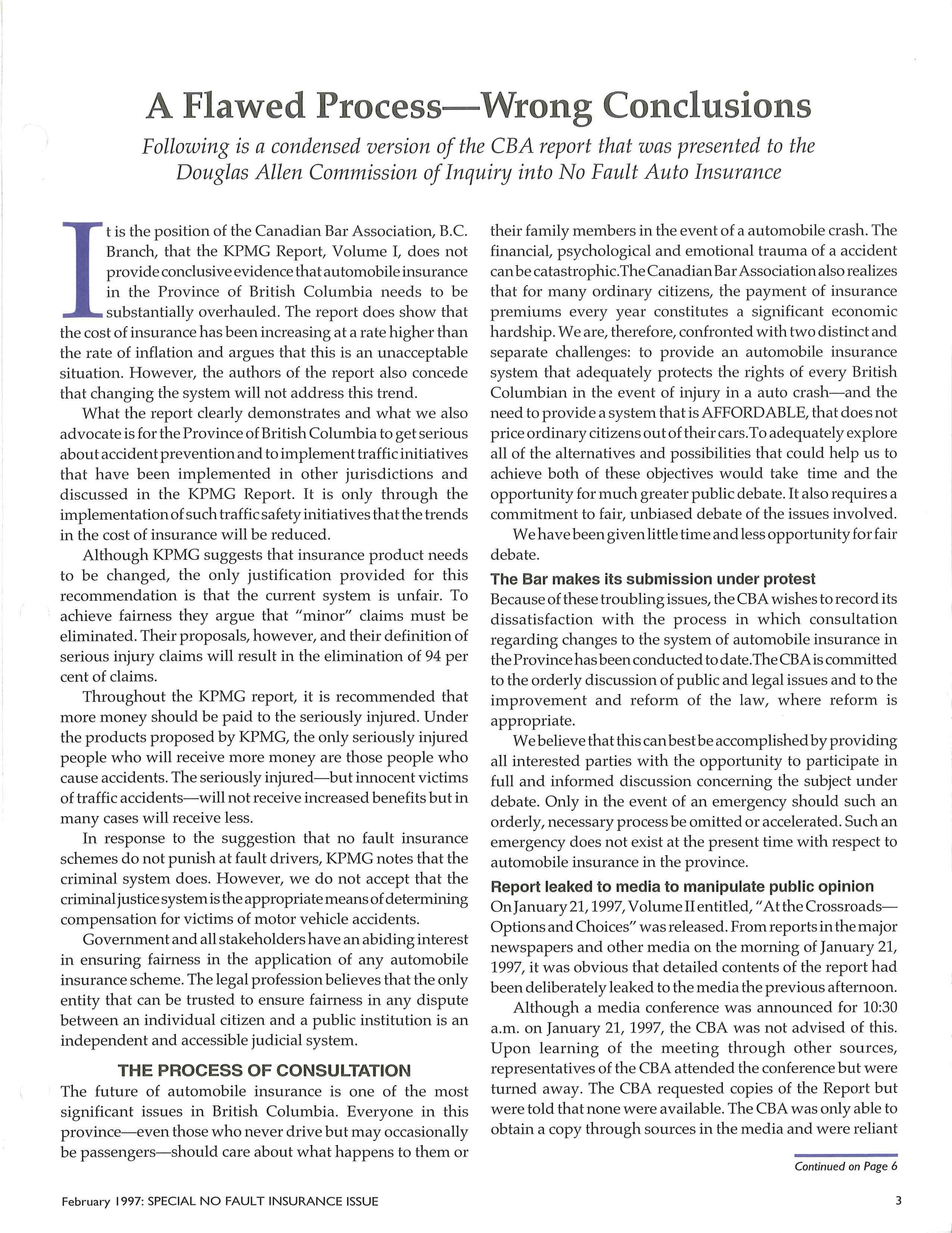 The CBA report was critical of the process of consultation on auto insurance reform and of the recently-released Volume II ofthe KPMG consultant's report on automobile insurance in British