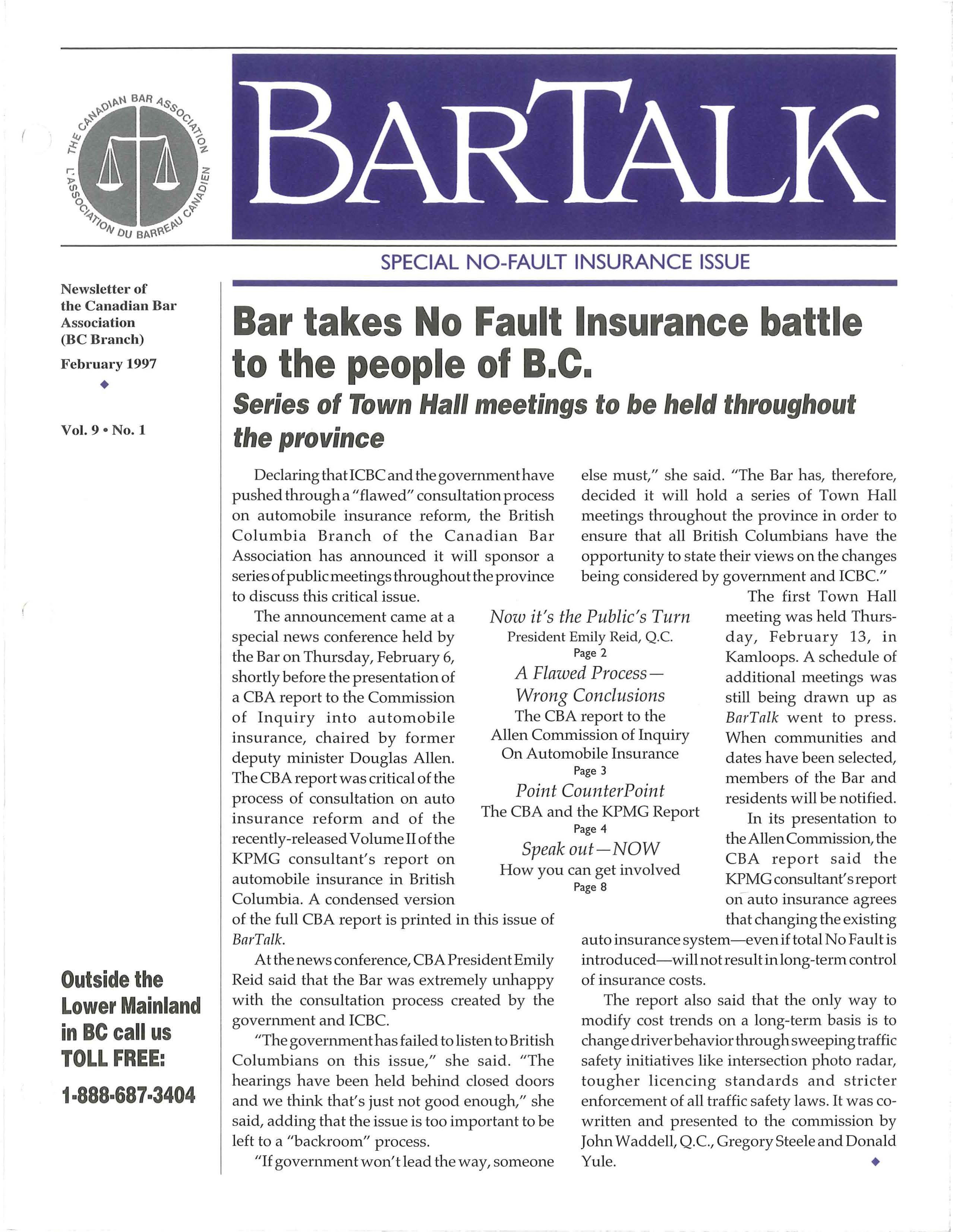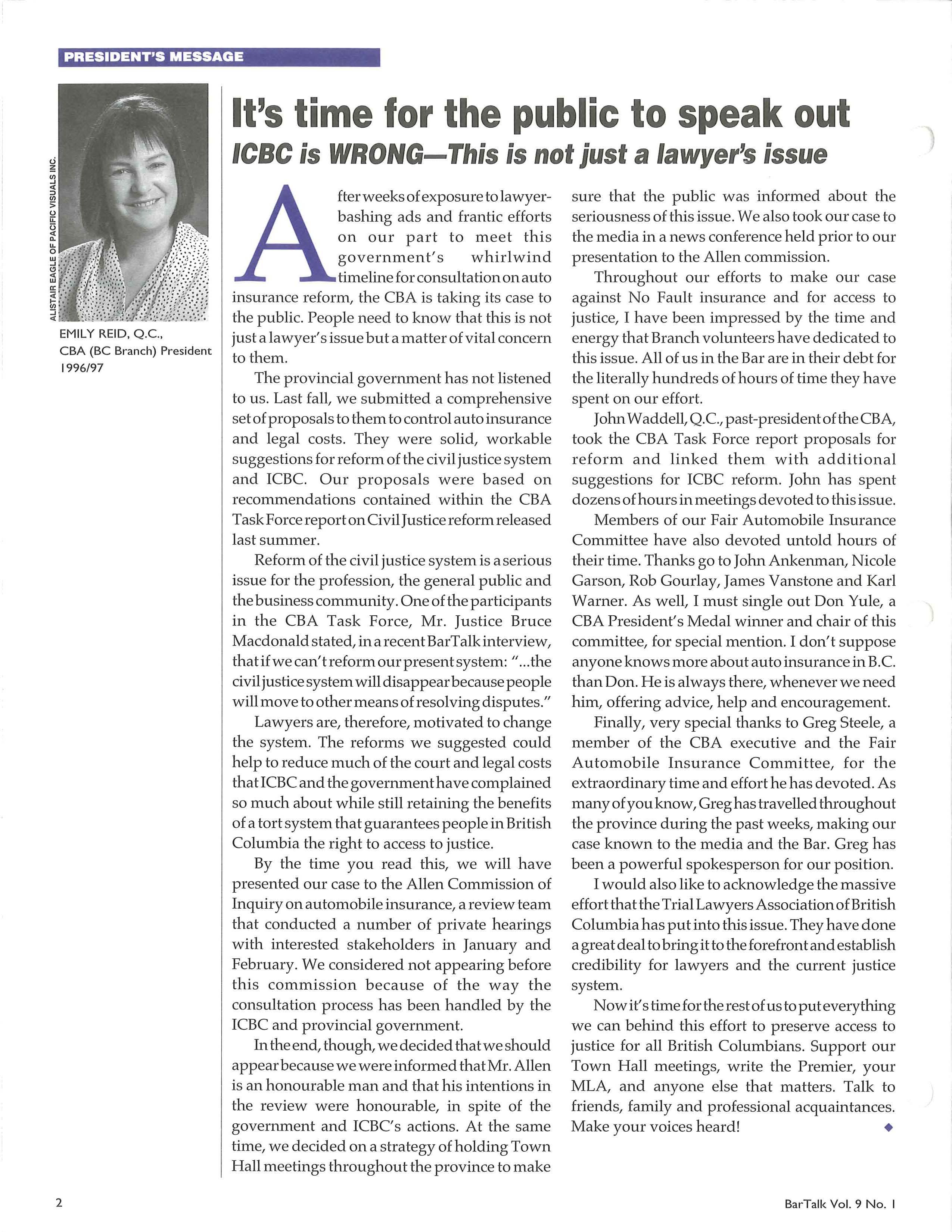 else must," she said "The Bar has, therefore, decided it will hold a series of Town Hall meetings throughout the province in order to ensure that all British Columbians have the opportunity to state their views on the changes being considered by goverrunent and ICBC."