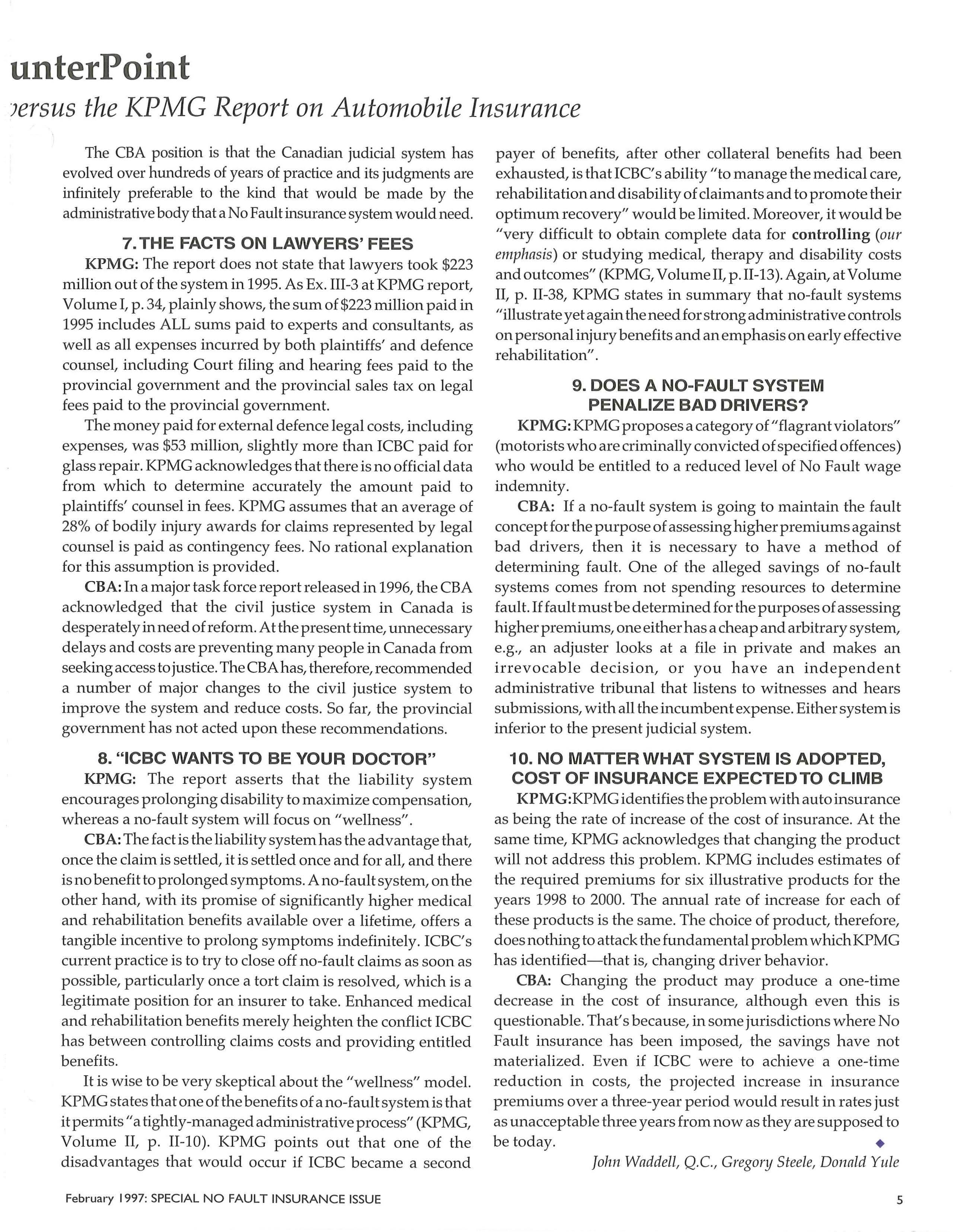 John Waddell, Q.C., past-president of the CBA, took the CBA Task Force report proposals for reform and linked them with additional suggestions for ICBC reform John has spent dozens of hours in meetings devoted to this issue