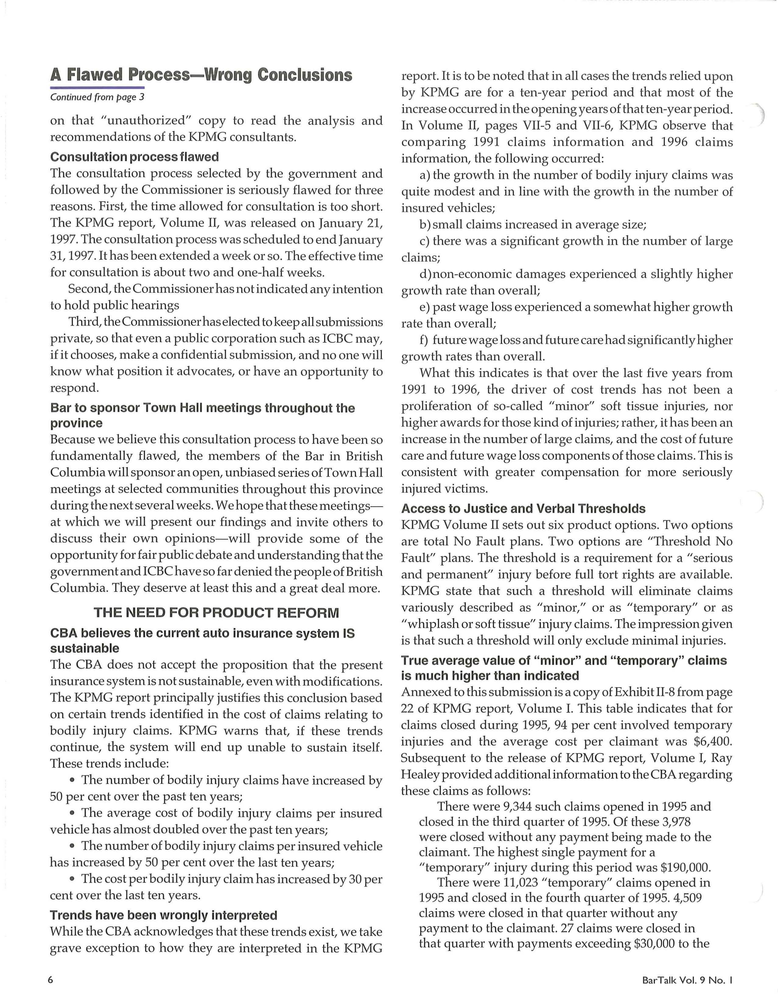 Because we believe this consultation process to have been so fundamentally flawed, the members of the Bar in British Columbia will sponsor an open, unbiased series of Town Hall meetings at selected communities throughout this province during the next several weeks. We hope that these meetingsat which we will present our findings and invite others to discuss their own opinions-will provide some of the opportunity for fair public debate and understanding that the government and ICBC have so far denied the people ofBritish Columbia They deserve at least this and a great deal more.