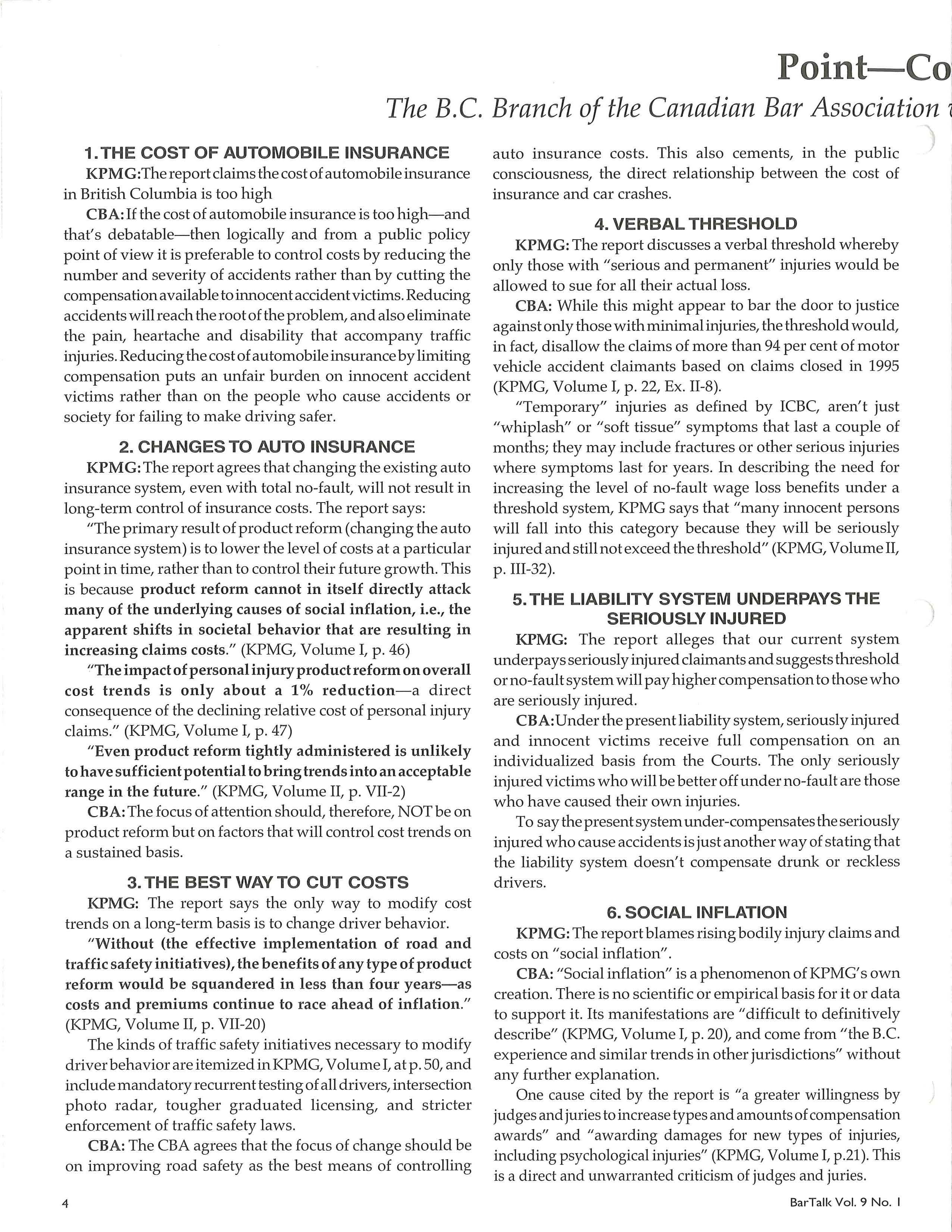 tis the position of the Canadian Bar Association, B.C. Branch, that the KPMG Report, Volume I, does not provide conclusive evidence that automobile insurance in the Province of British Columbia needs to be substantially overhauled. The report does show that the cost of insurance has been increasing at a rate higher than the rate of inflation and argues that this is an unacceptable situation. However, the authors of the report also concede that changing the system will not address this trend.
