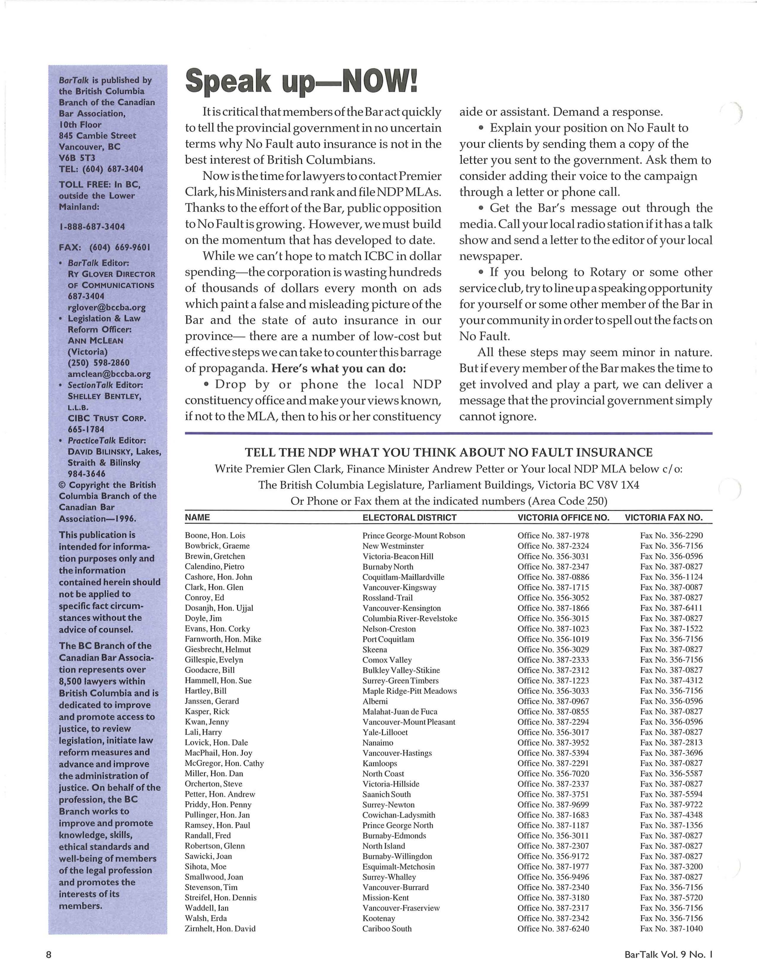 Now is the time for lawyers to contact Premier Clark, his Ministers and rank and file NDPMLAs. Thanks to the effort of the Bar, public opposition toNoFaultisgrowing However, we must build on the momentum that has developed to date.