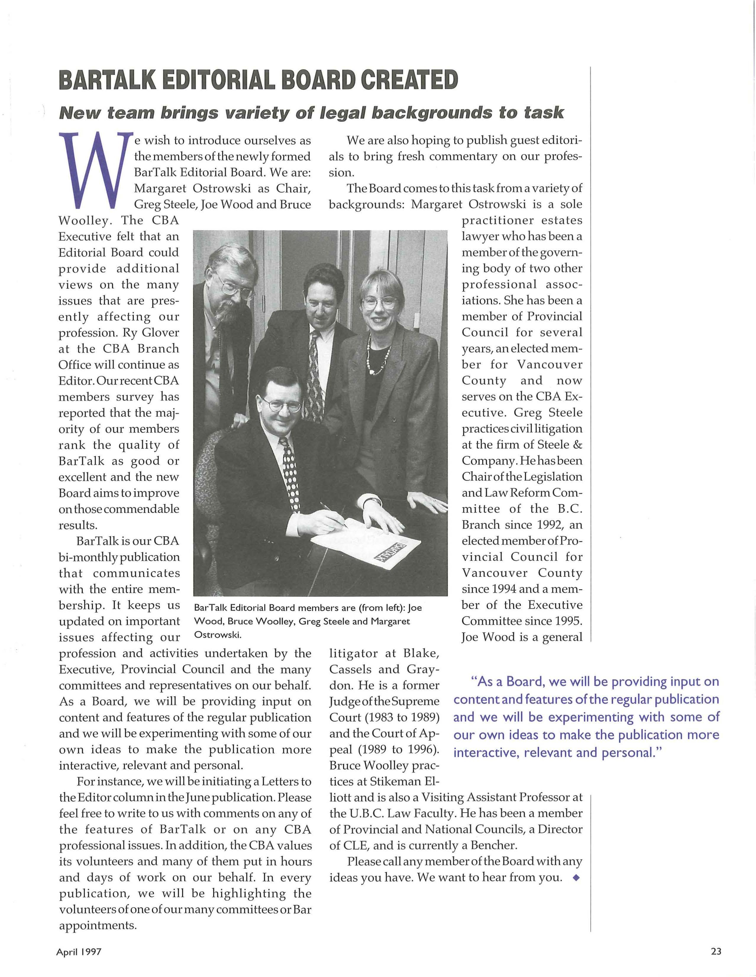 The Board comes to this task from a variety of backgrounds: Margaret Ostrowski is a sole practi honer estates lawyer who has been a member of the governing body of two other professional associations She has been a member of Provincial Council for several years, an elected member for Vancouver County and now serves on the CBA Executive. Greg Steele practices civil litigation at the firm of Steele & Company. He has been Chair of the Legislation and Law Reform Committee of the B . C. Branch since 1992, an elected member of Pro-