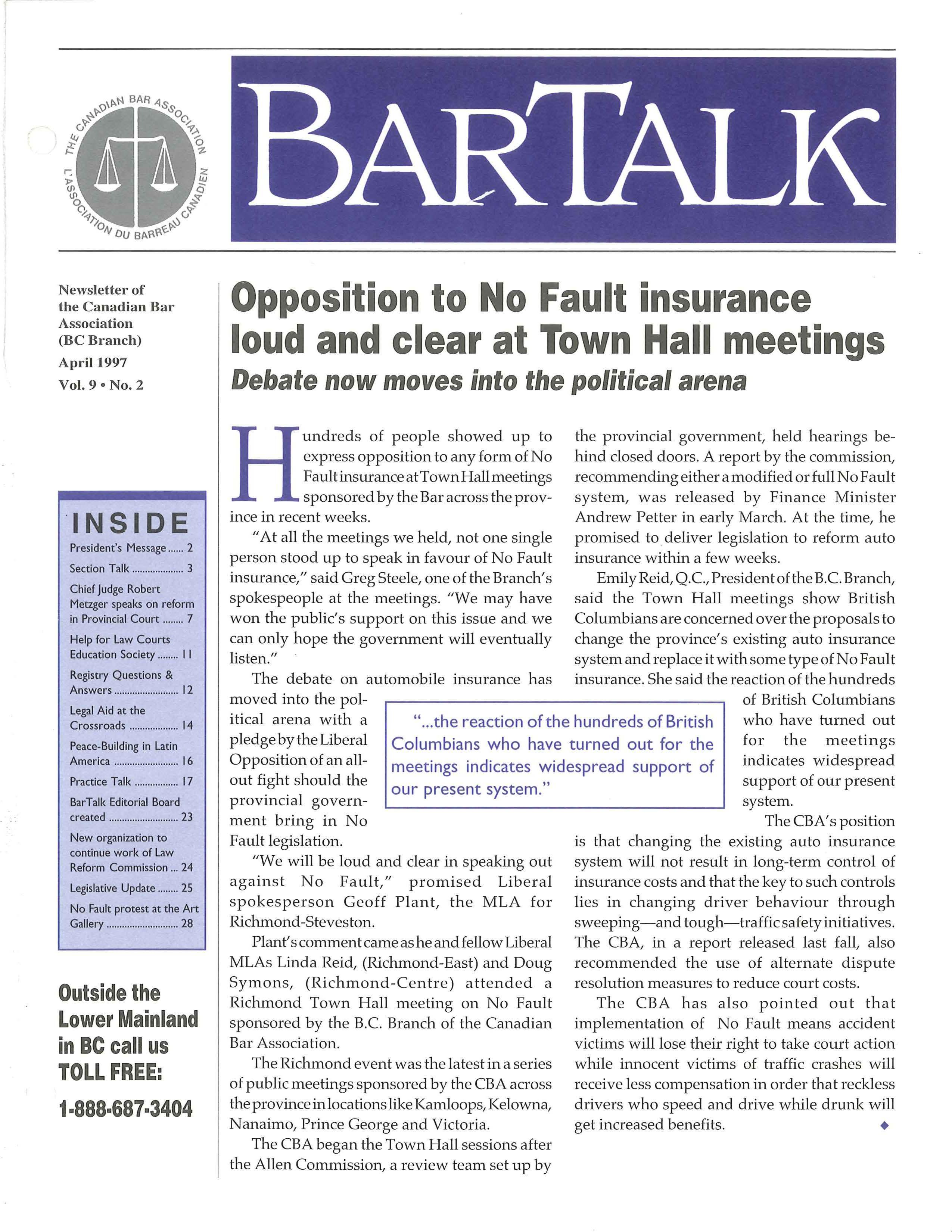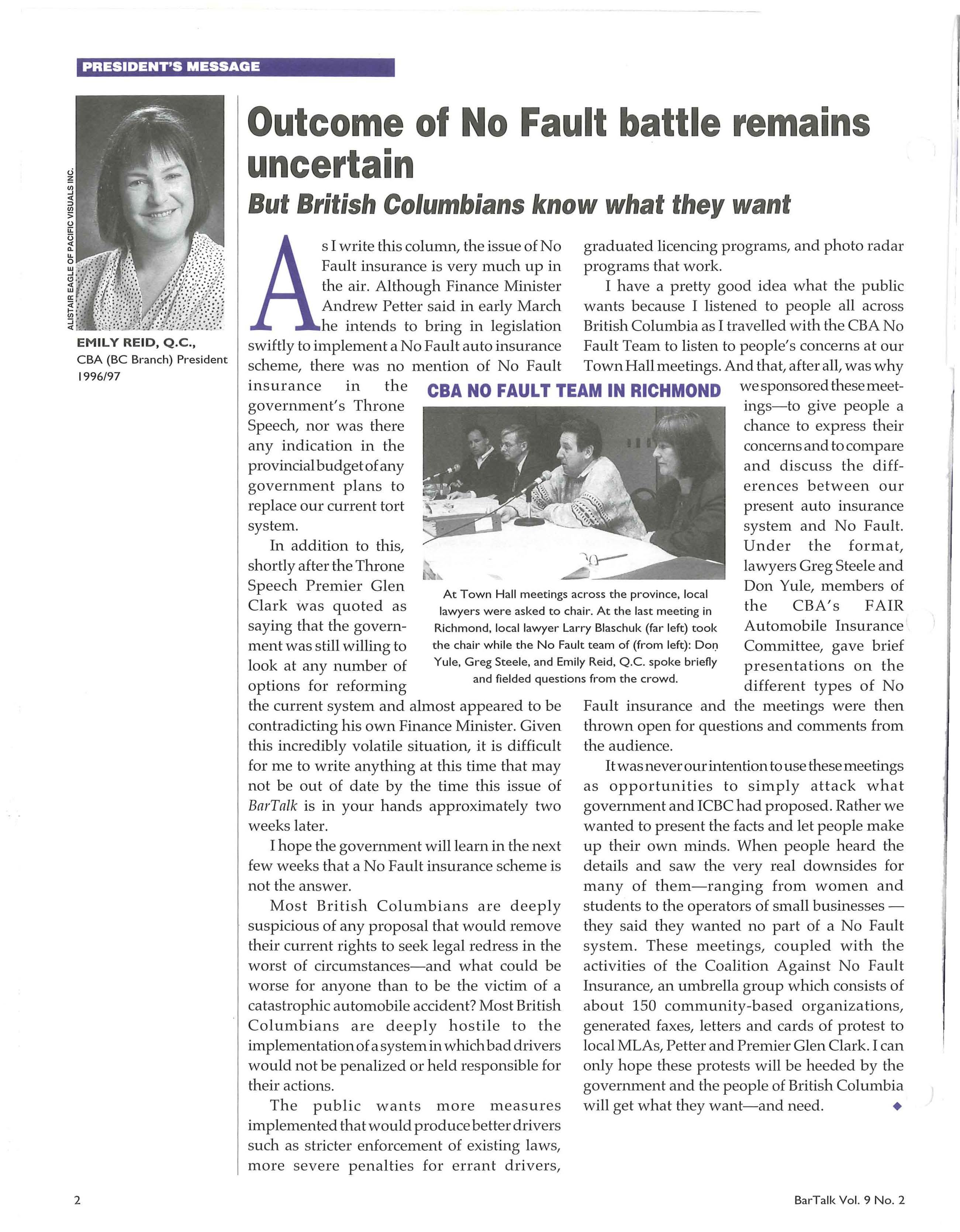 Emily Reid, Q C., President ofthe B C. Branch, said the Town Hall meetings show British Columbians are concerned over the proposals to change the province's existing auto insurance system and replace it with some type of No Fault insurance. She said the reaction of the hundreds of British Columbians moved into the political arena with a pledge by the Liberal Opposition of an allout fight should the provincial government bring in No