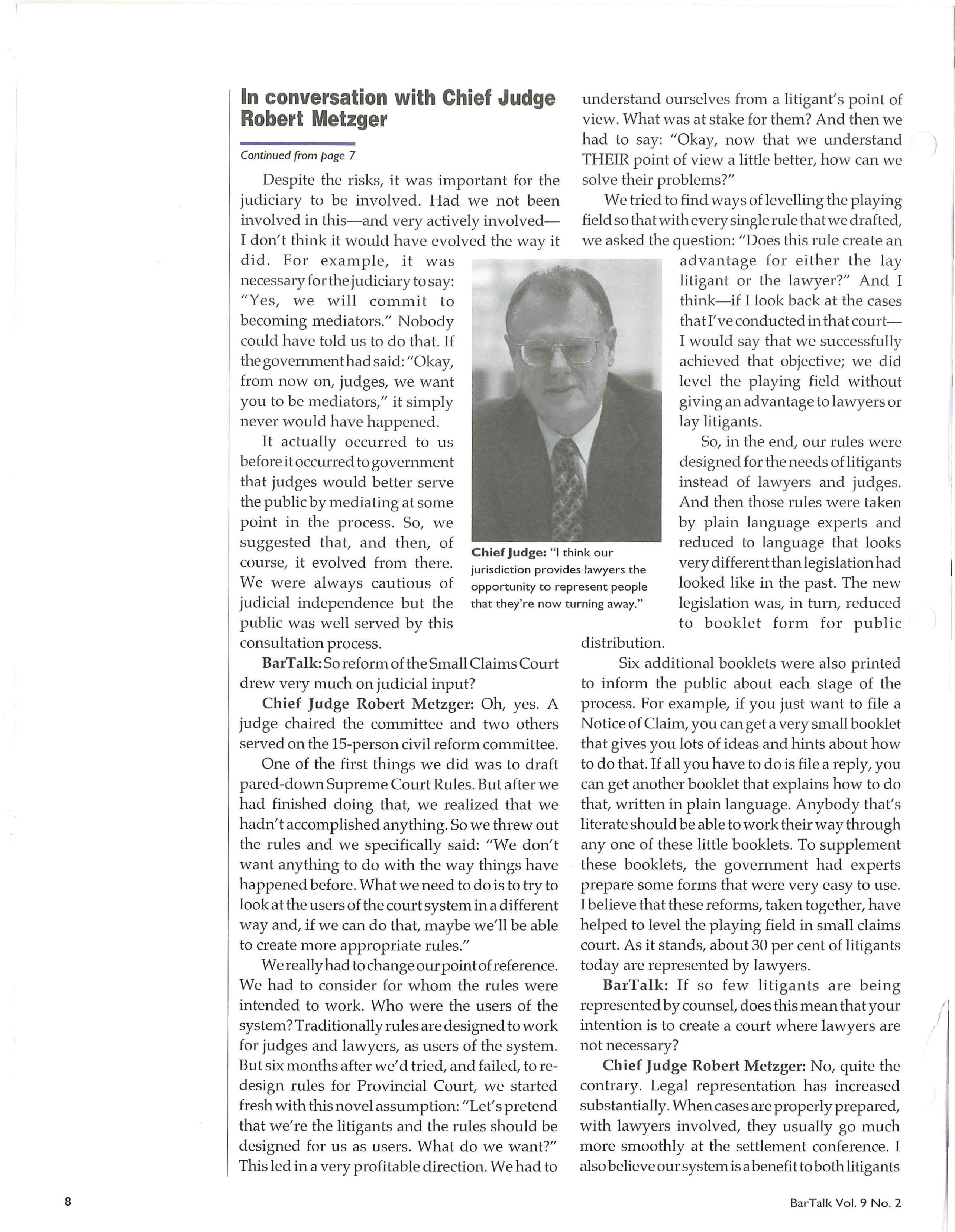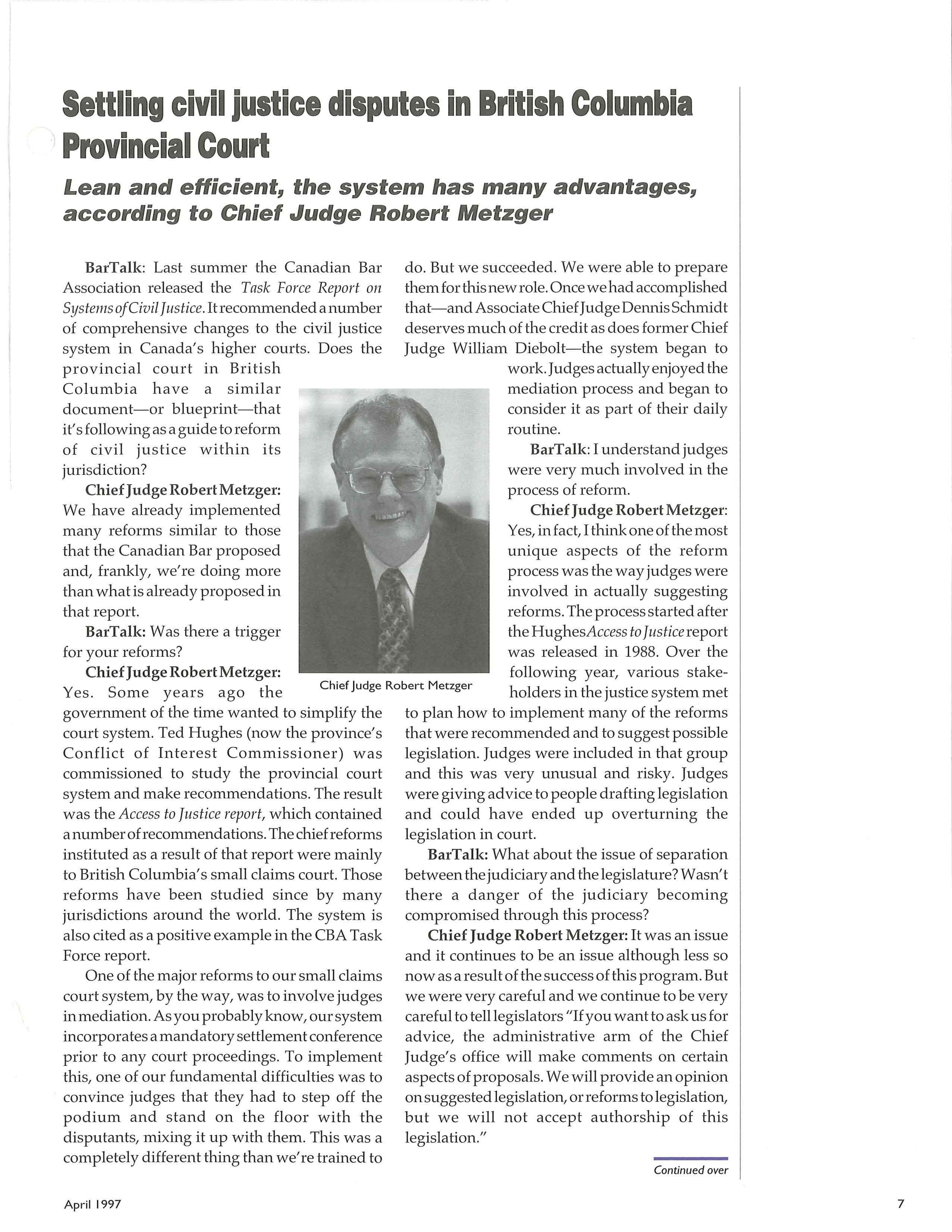 The Director of the Ministry of Attomey General's new Dispute Resolution Office made a presentation to Provincial Council at its December meeting. Jerry McHale said that the government has established the central office to implement its altemate dispute resolution policy, and to support such programs in the civil justice system and courts. The Office will not provide mediation or arbitration services directly, but will facilitate the use of altemate dispute resolution methods where appropriate.