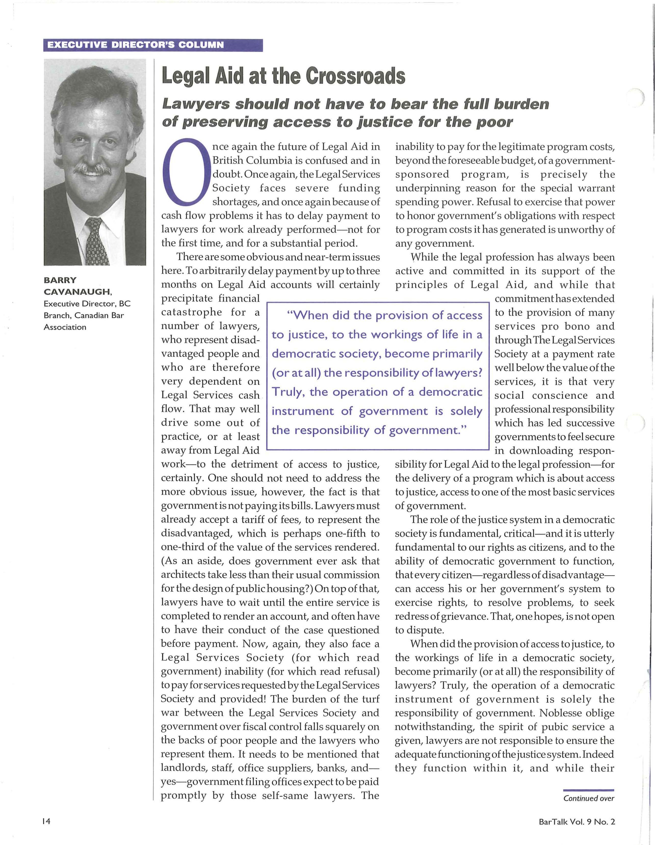 liott and is also a Visiting Assistant Professor at the U.B.C. Law Faculty . He has been a member of Provincial and National Councils, a Director of CLE, and is currently a Bencher . Please call any member of the Board with any ideas you have. We want to hear from you. •