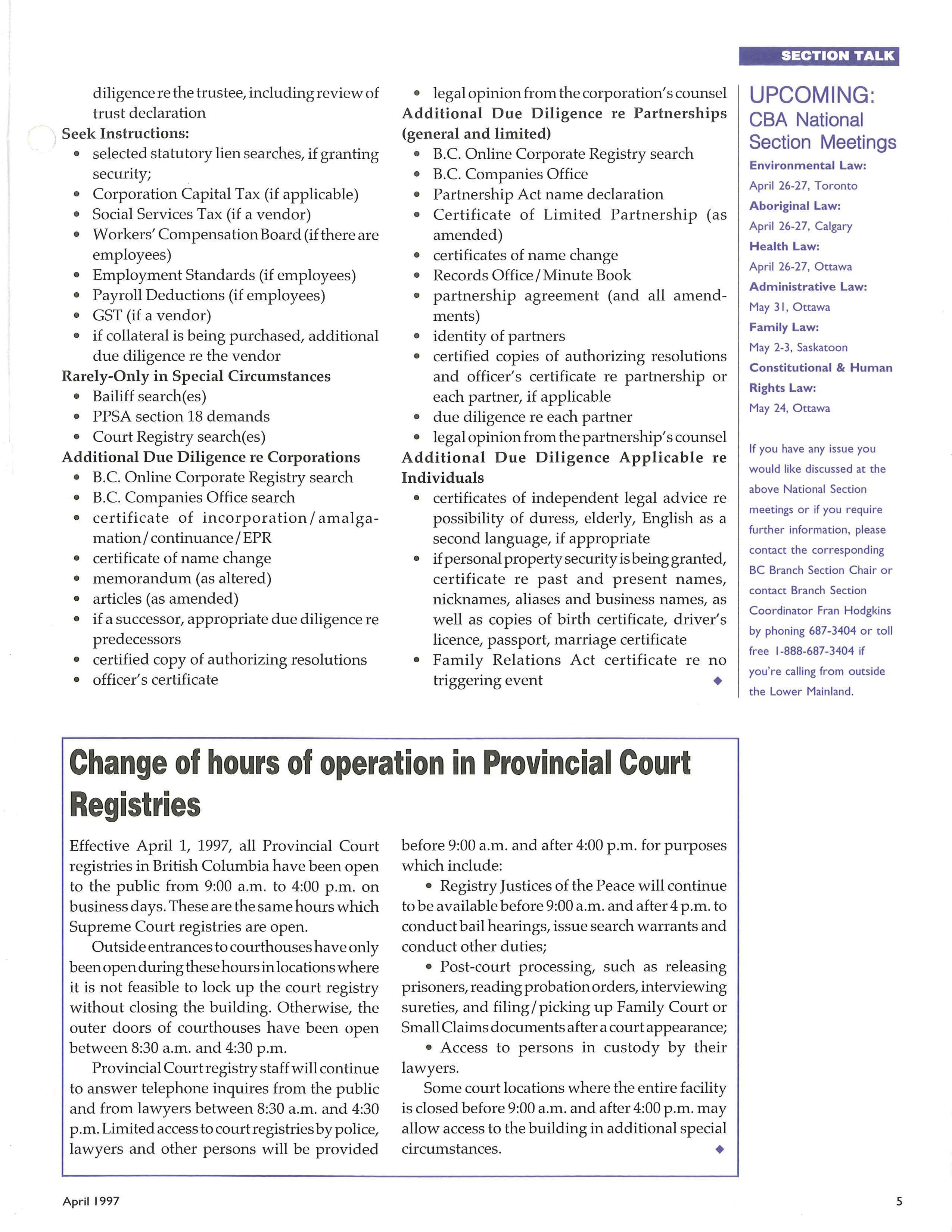 Effective April 1, 1997, all Provincial Court registries in British Columbia have been open to the public from 9:00 a m. to 4:00 p m. on business days. These are the same hours which Supreme Court registries are open.