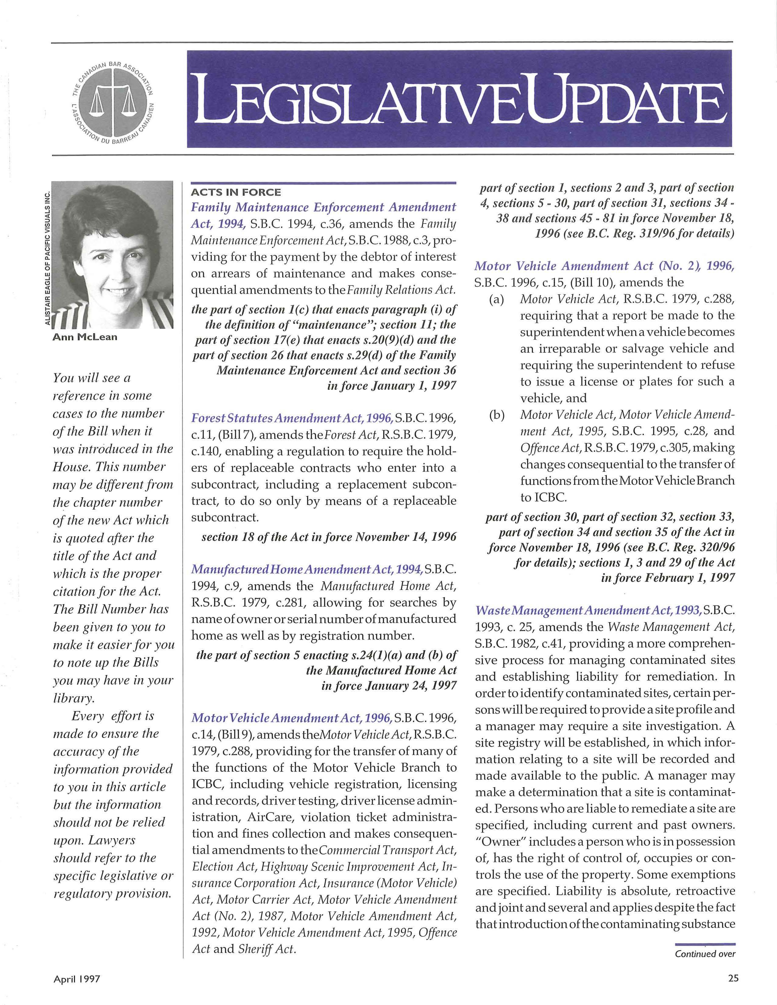 • Legislation & Law Reform Officer: ANN McLEAN (Victoria) (250) 598-2860 amclean@bccba.org