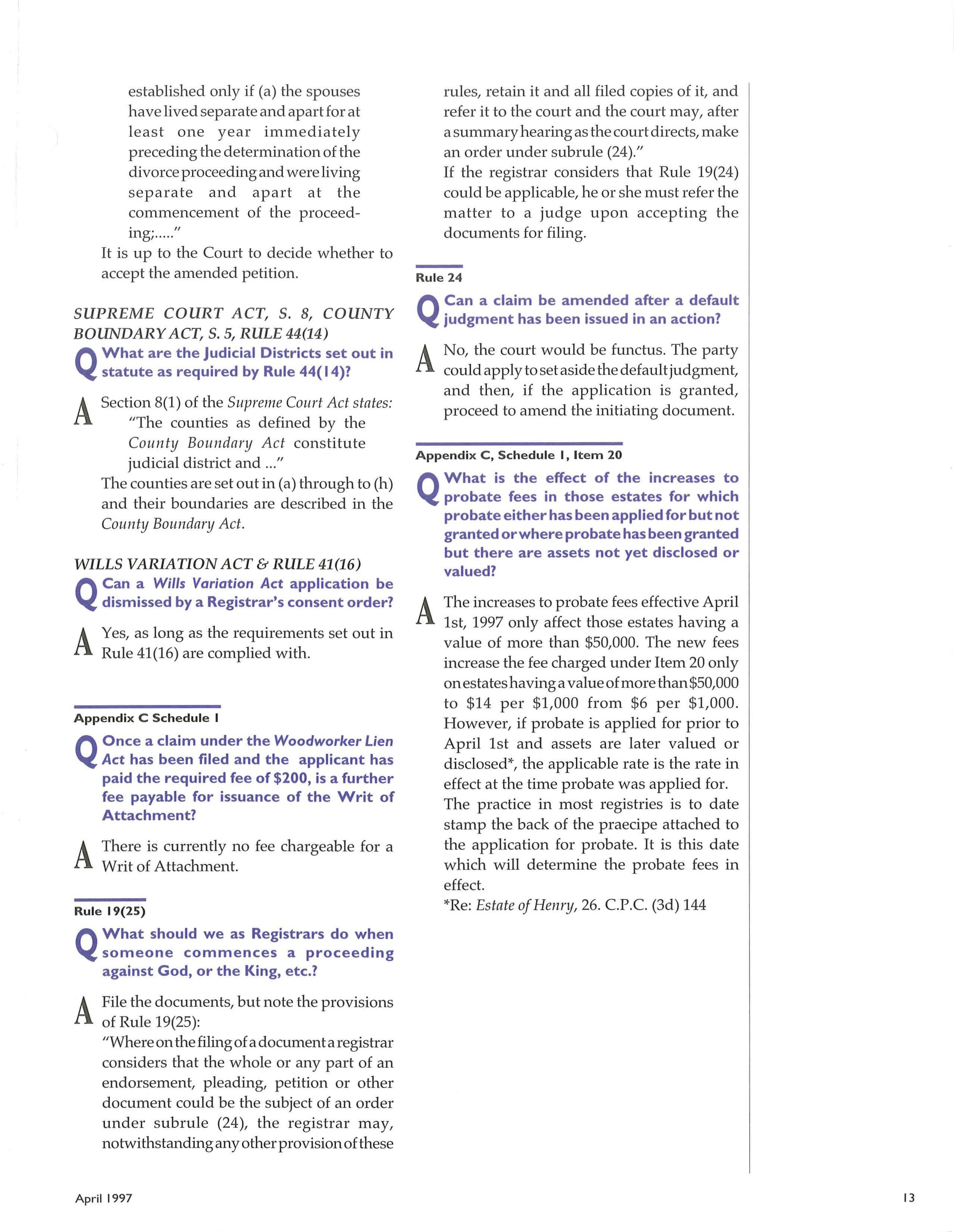 B.C. Reg. 357/ 96 effective Februan; 1, 1997 (b) increasing probate fees under Item 20 of Schedule 1 of Appendix C to $6 for every $1,000 value or part thereof greater than $25,000 up to $50,000 and $14 for every $1,000 value or part thereof over $50,000