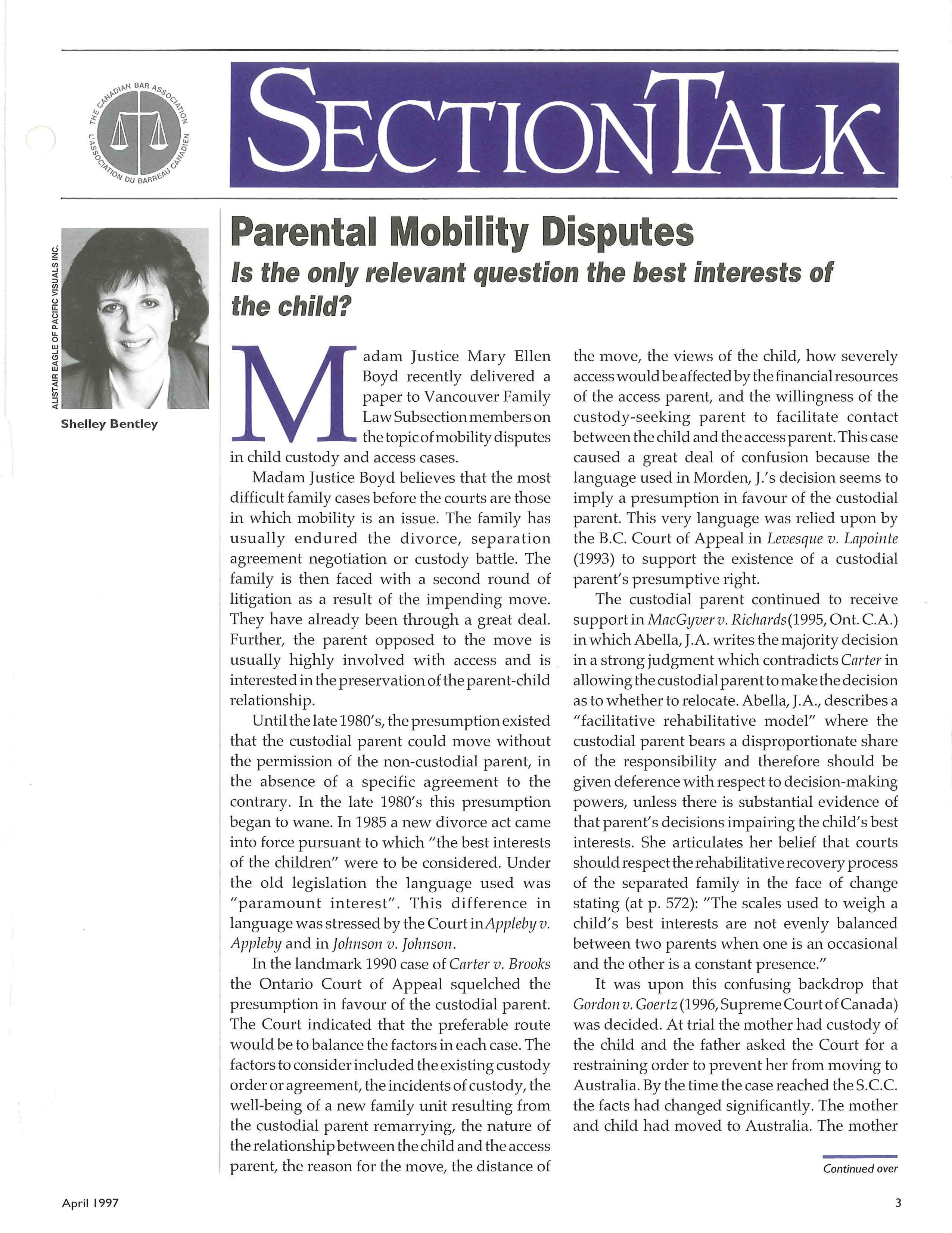 adam Justice Mary Ellen Boyd recently delivered a paper to Vancouver Family Law Subsection members on the topic of mobility disputes in child custody and access cases.