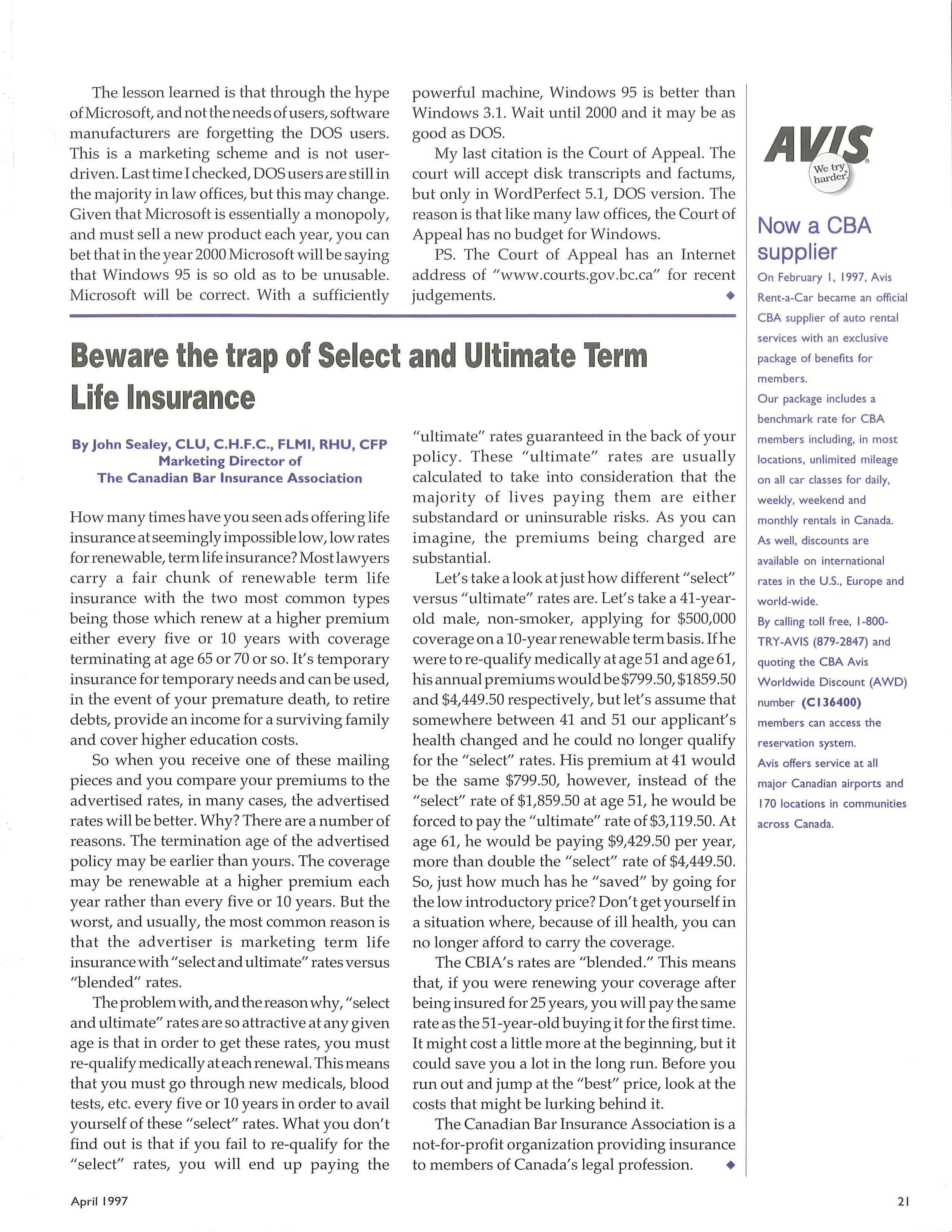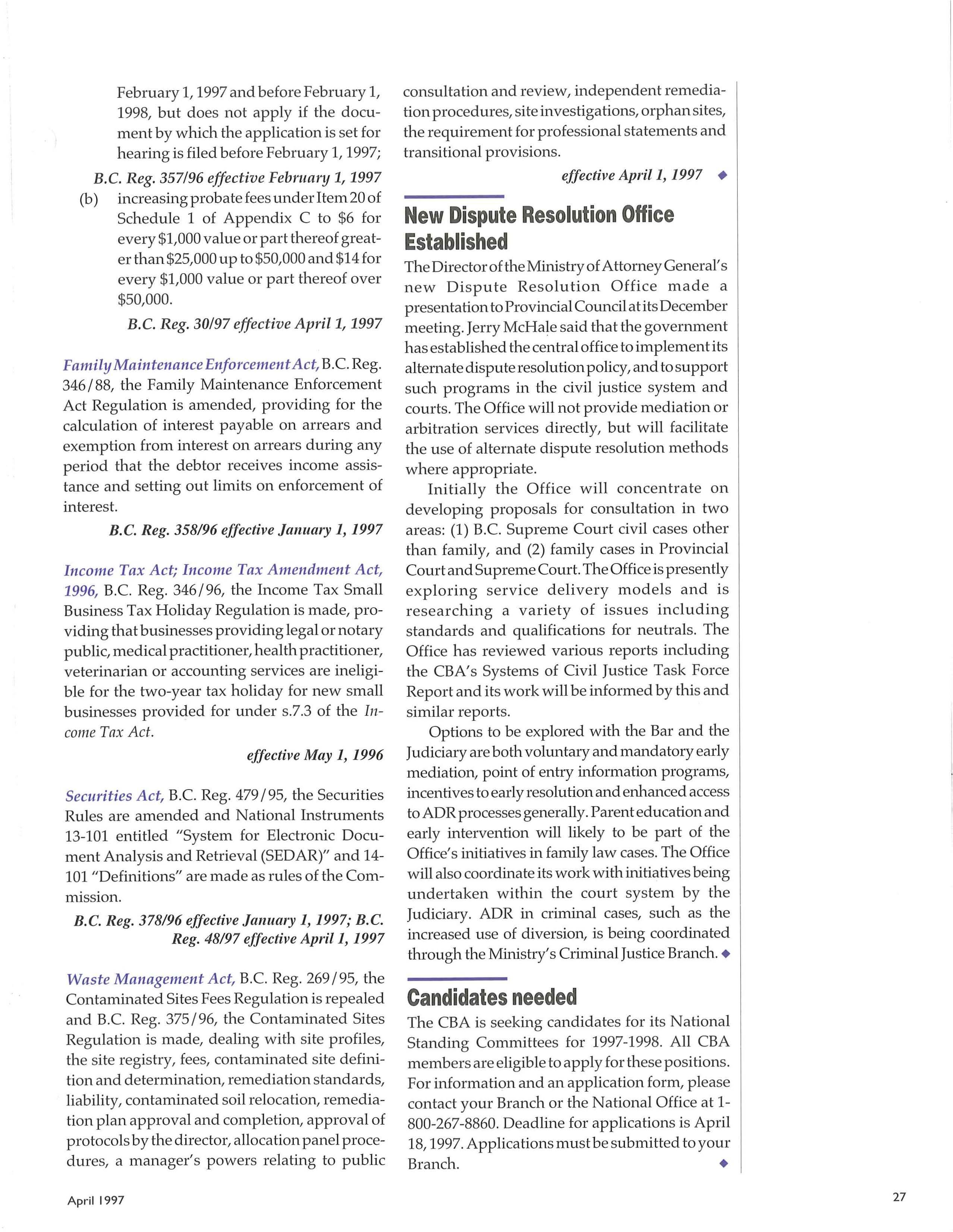 The CBA is seeking candidates for its National Standing Committees for 1997-1998. All CBA members are eligible to apply for these positions. For information and an application form, please contact your Branch or the National Office at 1800-267-8860. Deadline for applications is April 18, 1997. Applications must be submitted to your Branch. •