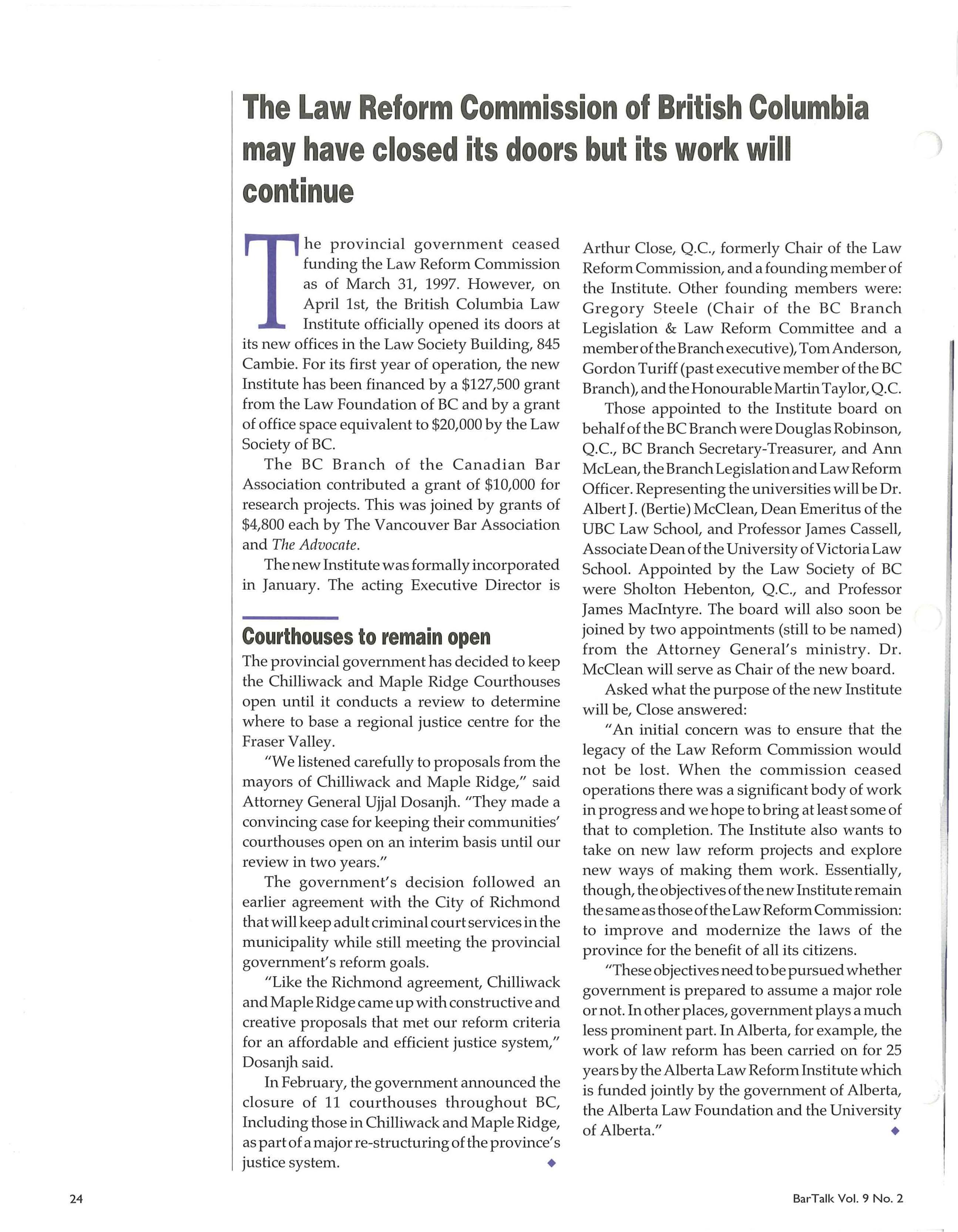 ,.. he provincial government ceased funding the La w Reform Commission as of March 31, 1997. However, on April 1st, the British Columbi a Law Institute officially opened its doors at its new offices in the Law Society Building, 845 Cambie. For its fir s t year of operation, the new Institute has been financed by a $127,500 grant from the Law Foundation of BC and by a grant of office s pace equivalent to $20,000 by th e Law Society of BC.
