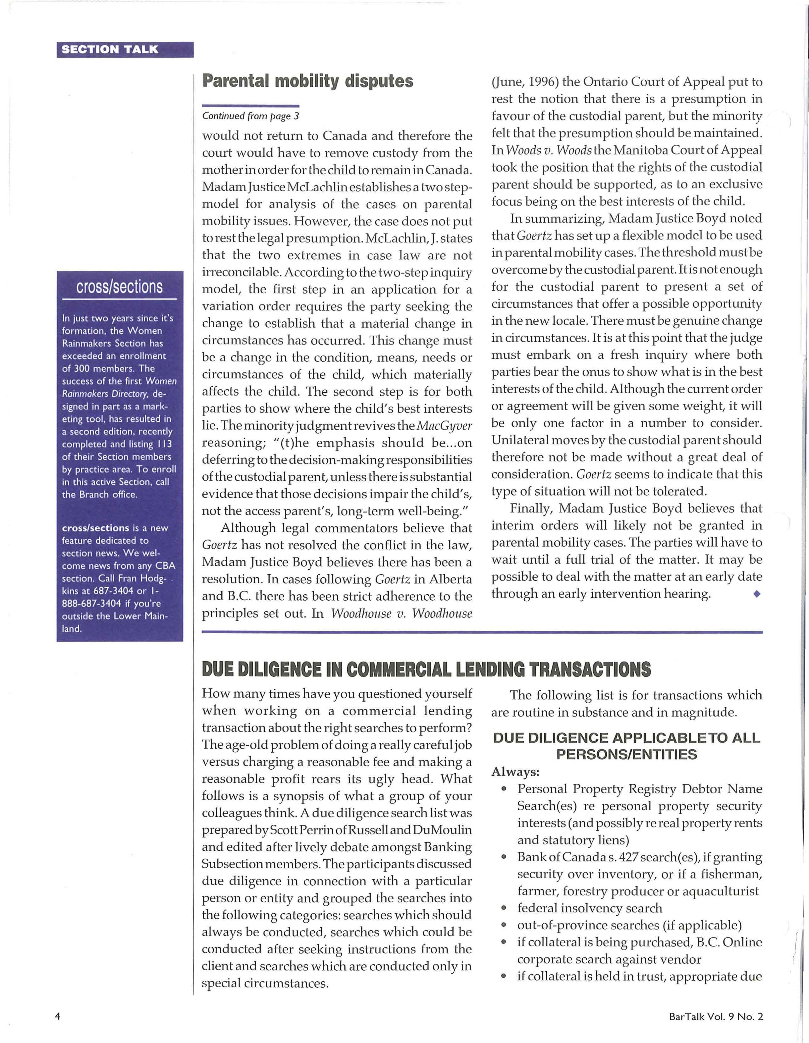 Continued from page 3 would not return to Canada and therefore the court would have to remove custody from the mother in order for the child to remain in Canada. Madam Justice McLachlin establishes a two stepmodel for analysis of the cases on parental mobility issues. However, the case does not put to rest the legal presumption McLachlin, J states that the two extremes in case law are not irreconcilable. According to the two-step inquiry model, the first step in an application for a variation order requires the party seeking the change to establish that a material change in circumstances has occurred. This change must be a change in the condition, means, needs or circumstances of the child, which materially affects the child. The second step is for both parties to show where the child's best interests lie. The minority judgment revives the MacGyver reasoning; "(t)he emphasis should be ... on deferring to the decision-making responsibilities of the custodial parent, unless there is substantial evidence that those decisions impair the child's, not the access parent's, long-term well-being."