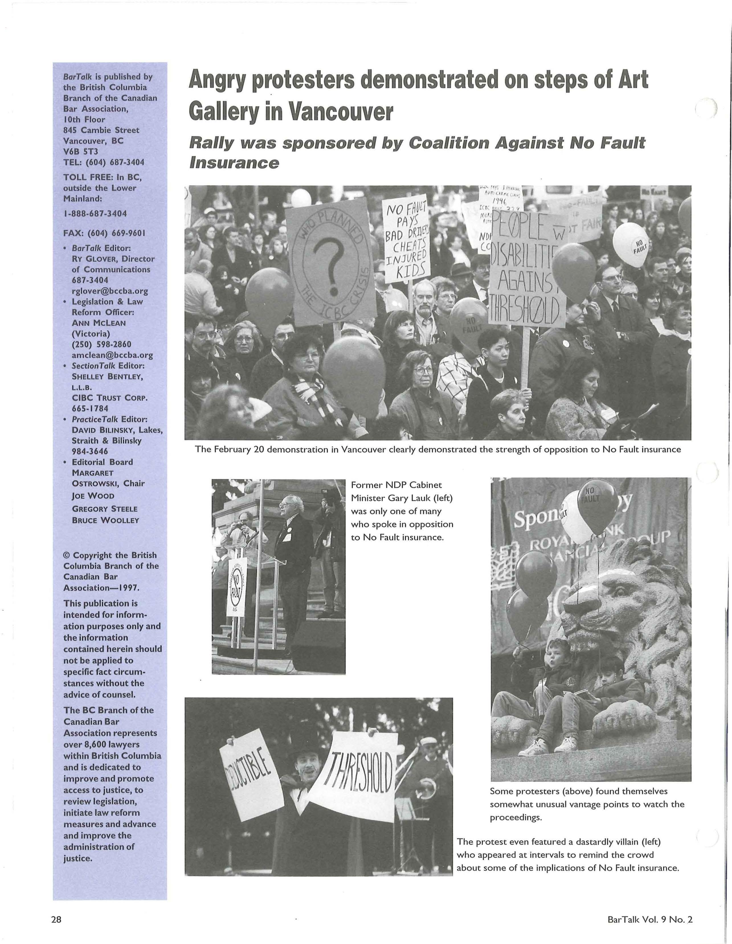 Most British Columbians are deeply students to the operators of small businessessuspicious of any proposal that would remove they said they wanted no part of a No Fault their current rights to seek legal redress in the system. These meetings, coupled with the worst of circumstances-and what could be activities of the Coalition Against No Fault worse for anyone than to be the victim of a Insurance, an umbrella group which consists of catastrophic automobile accident? Most British about 150 community-based organizations, Columbians are deeply hostile to the generated faxes, letters and cards of protest to implementation of a system in which bad drivers local MLAs, Petter and Premier Glen Clark. I can would not be penalized or held responsible for only hope these protests will be heeded by the their actions. government and the people of British Columbia