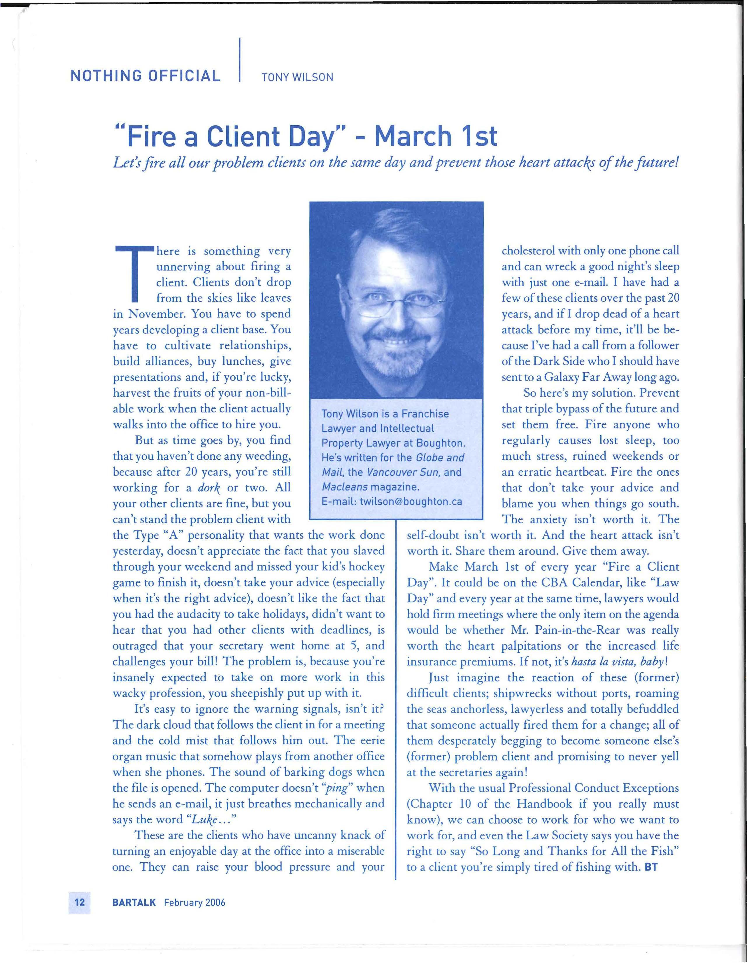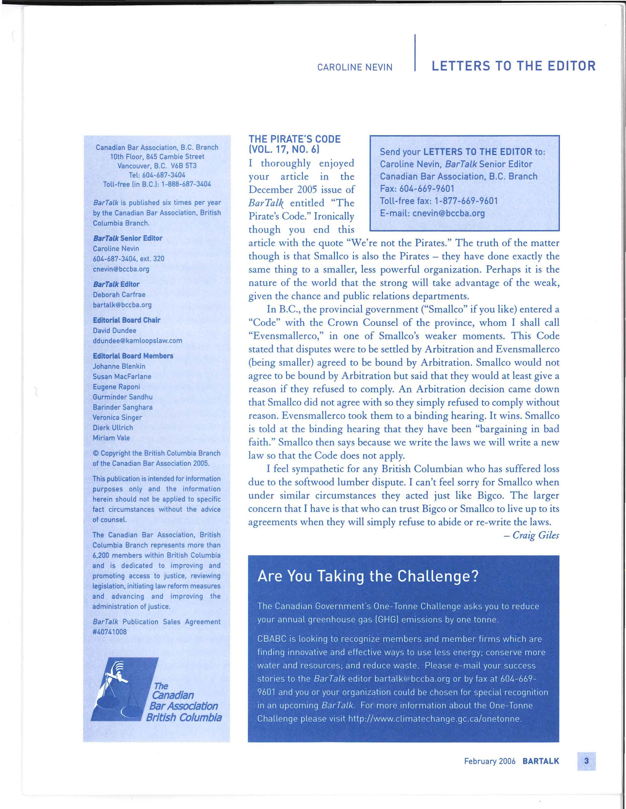 I thoroughly enjoyed your article in the December 2005 issue of BarTalk entitled " The Pirate's Code ." Ironically though you end this