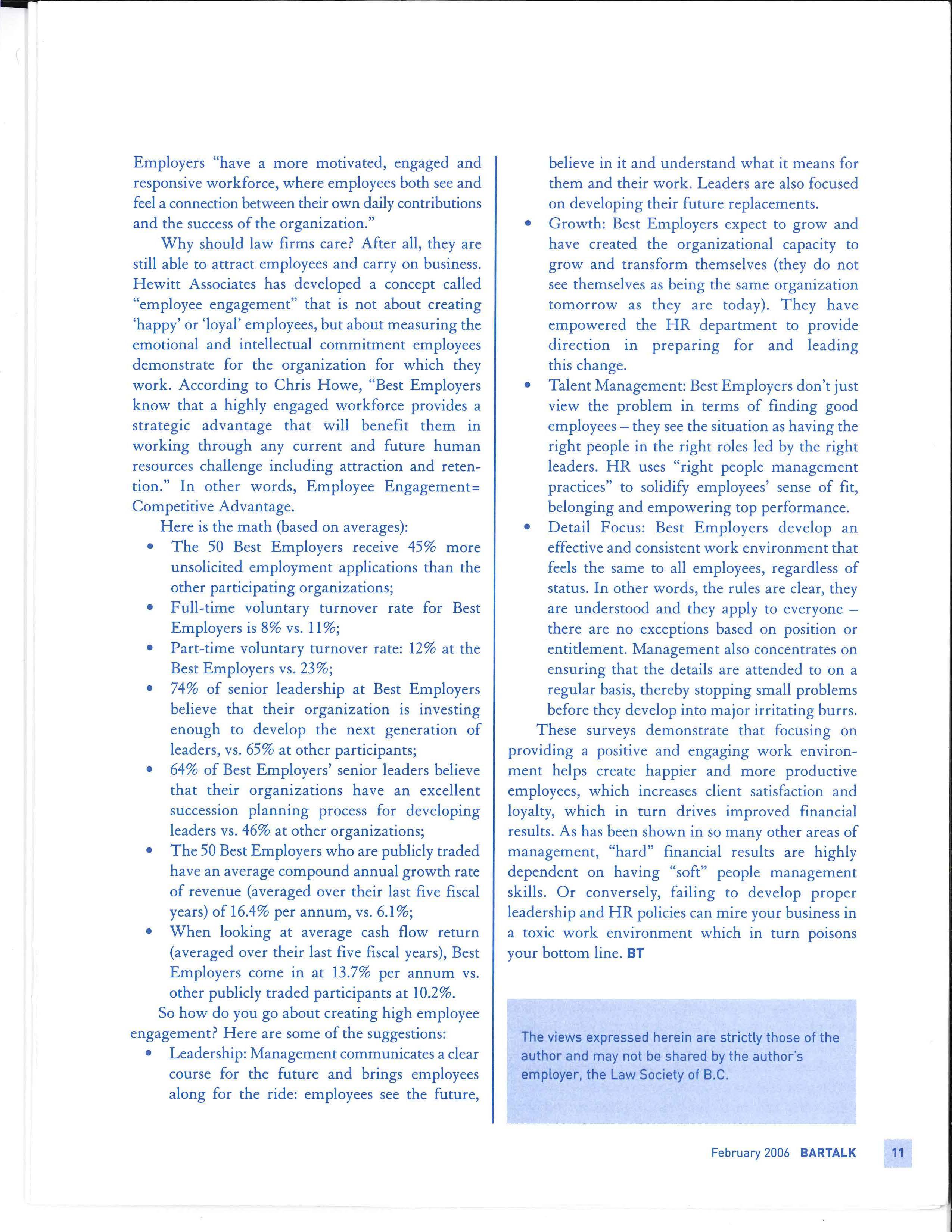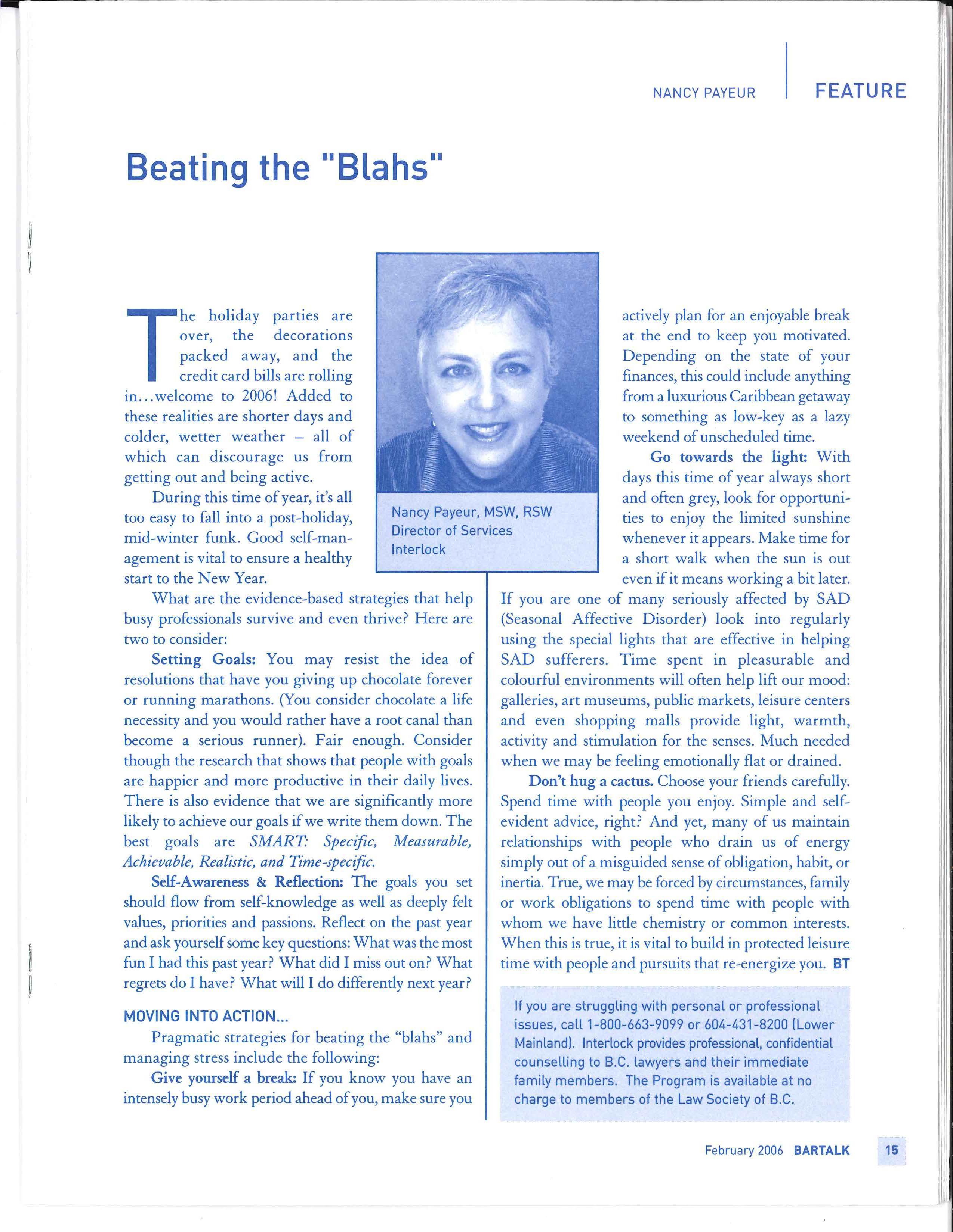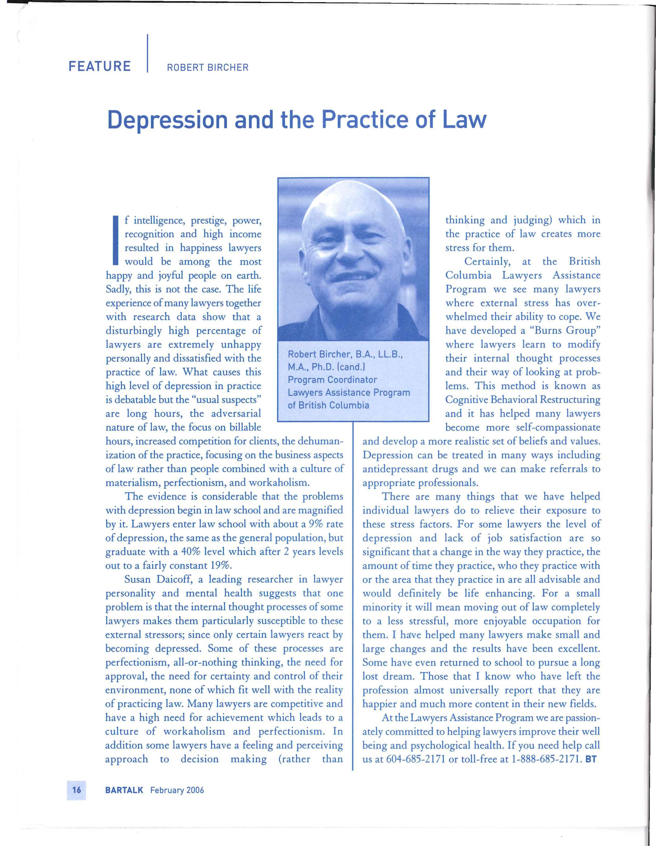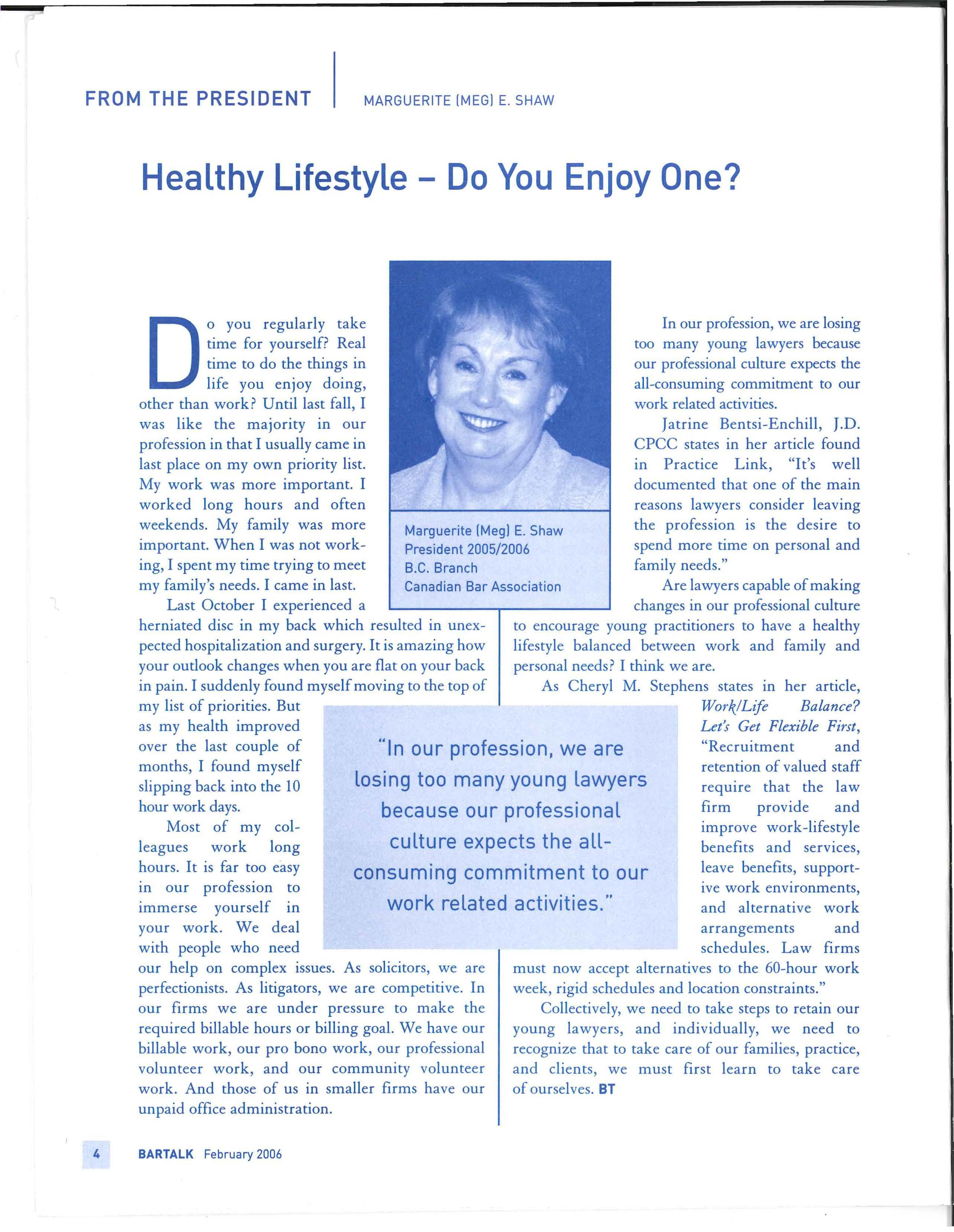 activities." your work We deal with people who need our help on complex issues . As solicitors, we are perfectionists. As litigators, we are competitive. In our firms we are under pressure to make the required billable hours or billing goal. We have our billable work, our pro bono work, our professional volunteer work, and our community volunteer work. And those of us in smaller firms have our unpaid office administration . 4 BARTALK Feb r uary