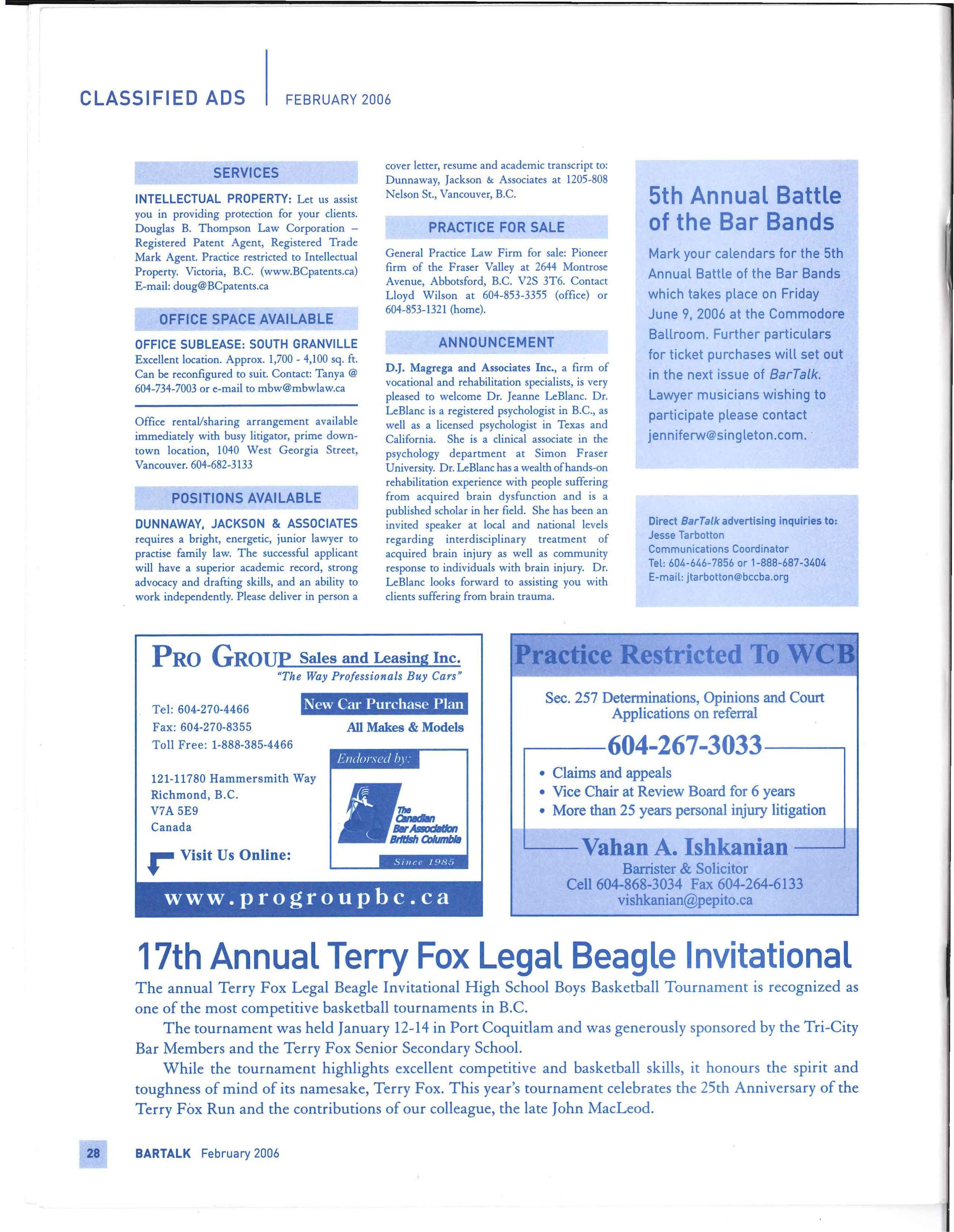 Mark your calendars for the 5th Annual Battle of the Bar Bands which takes place on Friday June 9, 2006 at the Commodore Ballroom Further particulars for ticket purchases will set out in the nex t issue of BarTalk. Lawyer musicians wishing to participate please contact jenniferw @singleton.com. ·