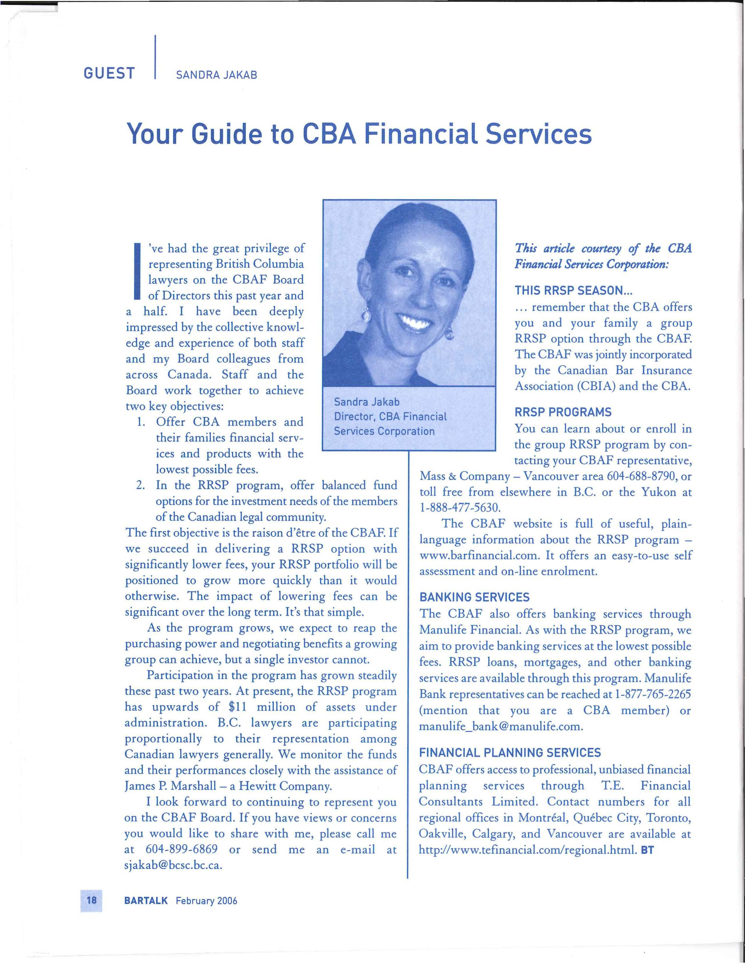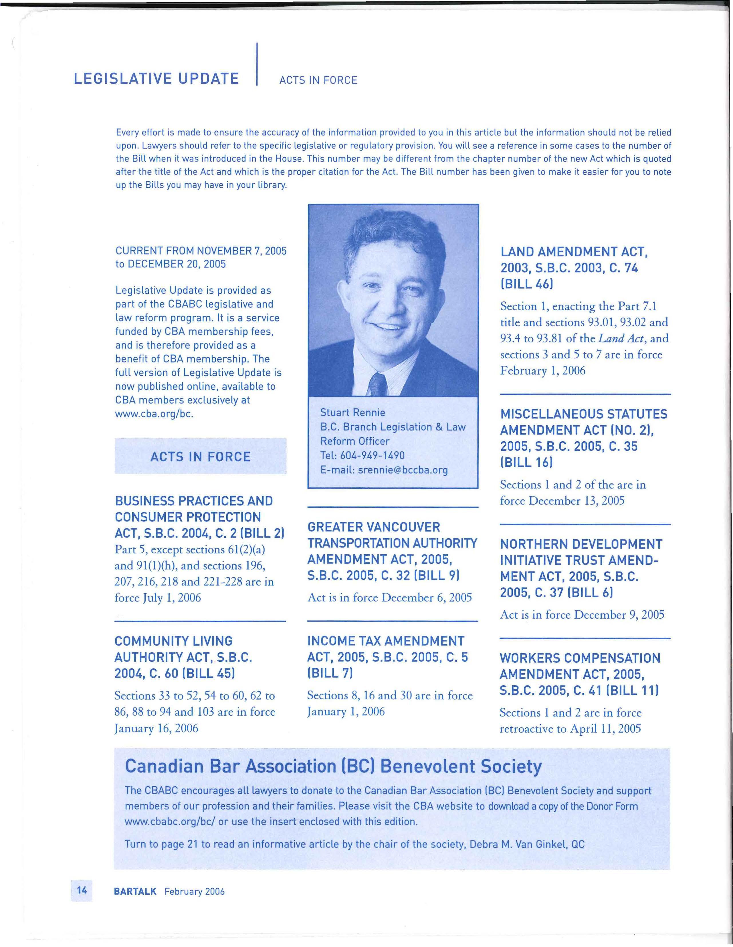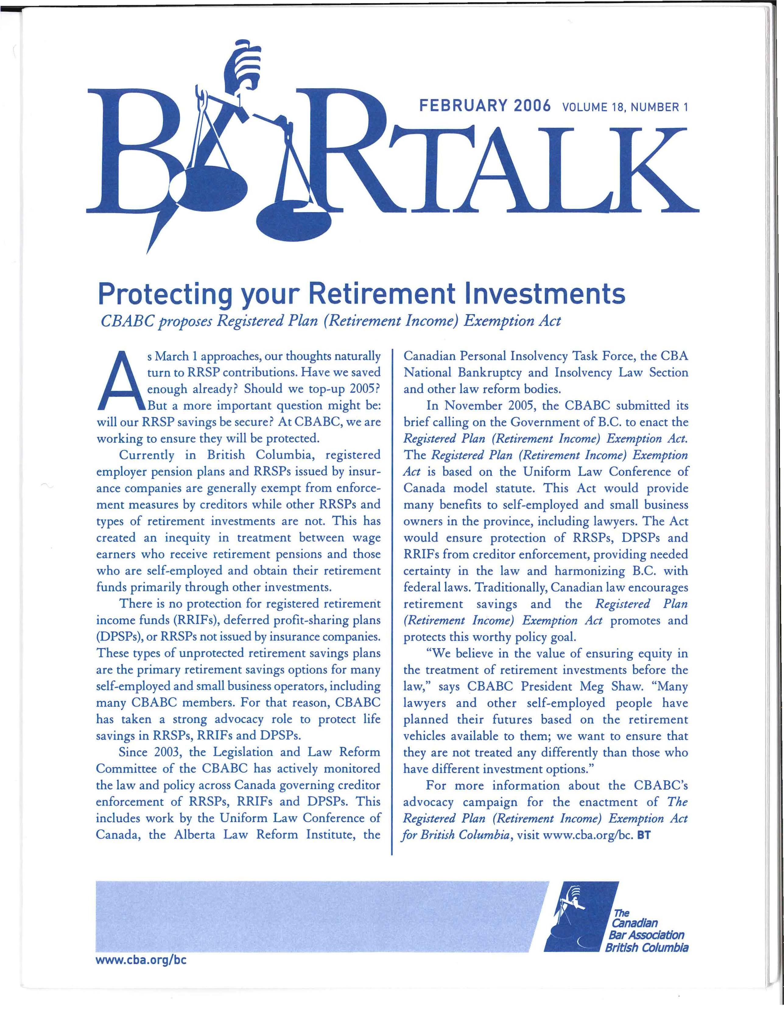 For more information about the CBABC's advocacy campaign for the enactment of The Registered Plan (Retirement Income) Exemption Act fo r British Columbia, visit www.cba.org/bc. BT