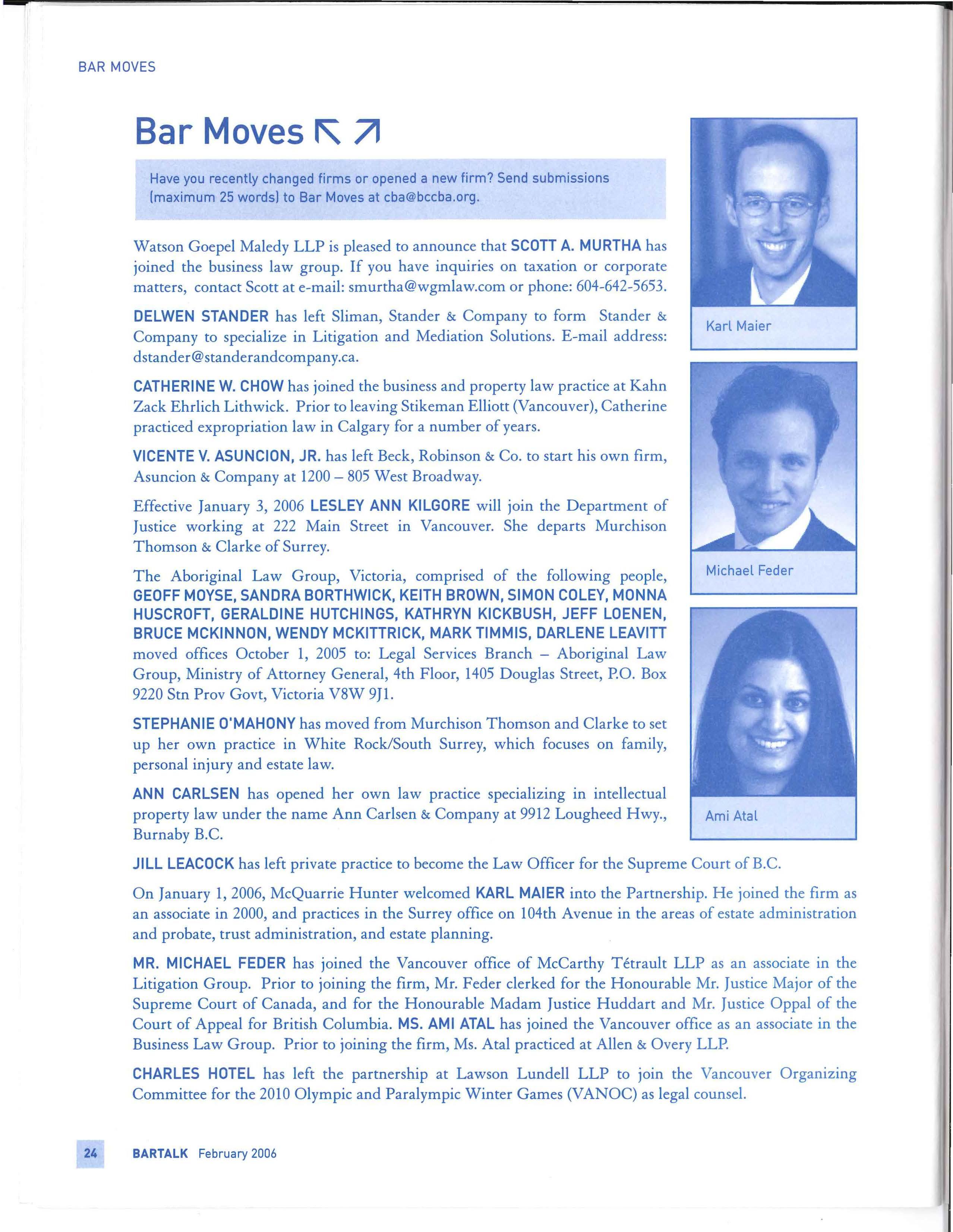 MR. MICHAEL FEDER has joined the Vancouver office of McCarthy Tetrault LLP as an associate in the Litigation Group. Prior to joining the firm, Mr. Feder clerked for the Honourable Mr Justice Major of the Supreme Court of Canada, and for the Honourable Madam Justice Huddart and Mr. Justice Oppal of the Court of Appeal for British Columbia. MS. AMI ATAL has joined the Vancouver office as an associate in the Business Law Group. Prior to joining the firm, Ms. Atal practiced at Allen & Overy LLP.