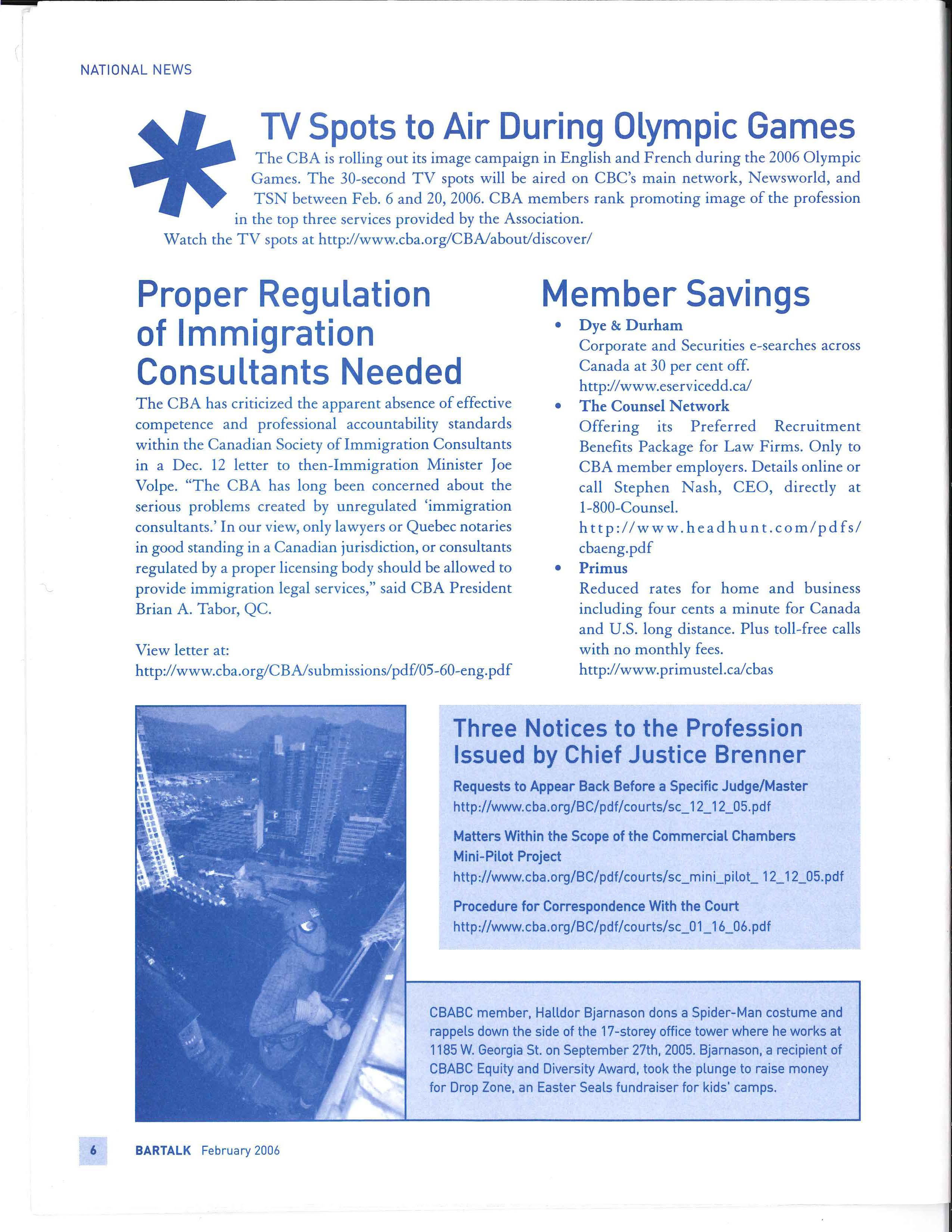 The CBA is rolling out its image campaign in English and French during the 2006 Olympic Games. The 30-second TV spots will be aired on CBC's main network, Newsworld, and TSN between Feb. 6 and 20, 2006. CBA members rank promoting image of the profession in the top three services provided by the Association. Watch the TV spots at http://www.cba.org/CBA/about/discover/