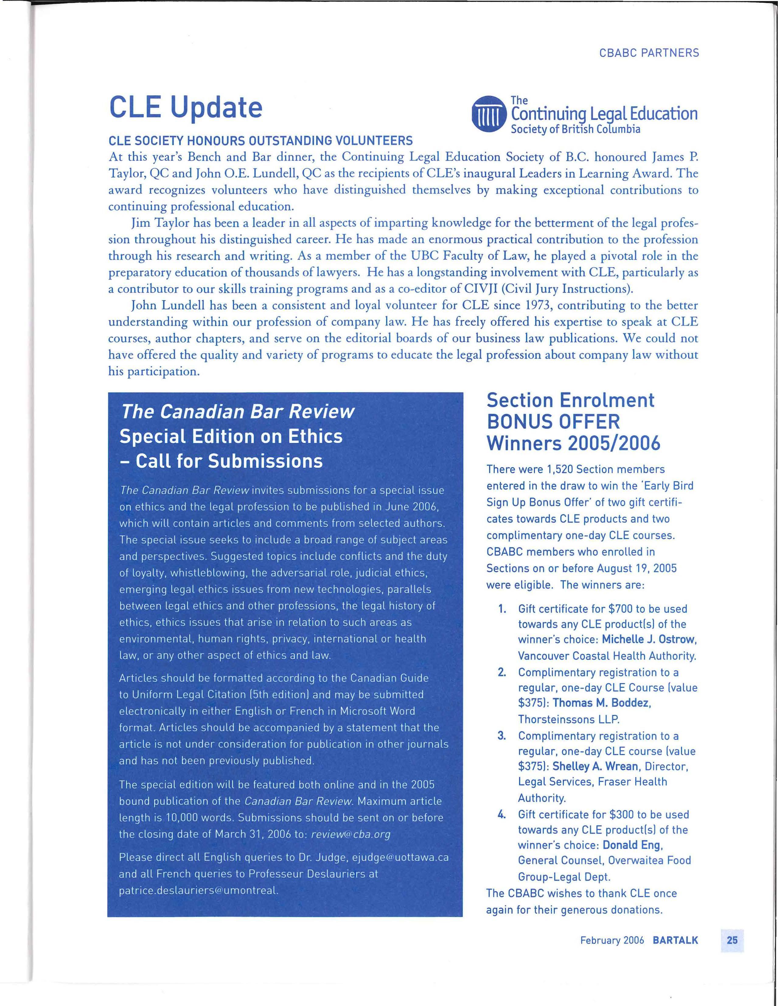 There were 1,520 Section members entered in the draw to win the ' Early Bird Sign Up Bonus Offer' of two gift certificates towards CLE products and two complimentary one-day CLE courses CBABC members who enrolled in Sections on or before August 19, 2005 were eligible. The winners are :
