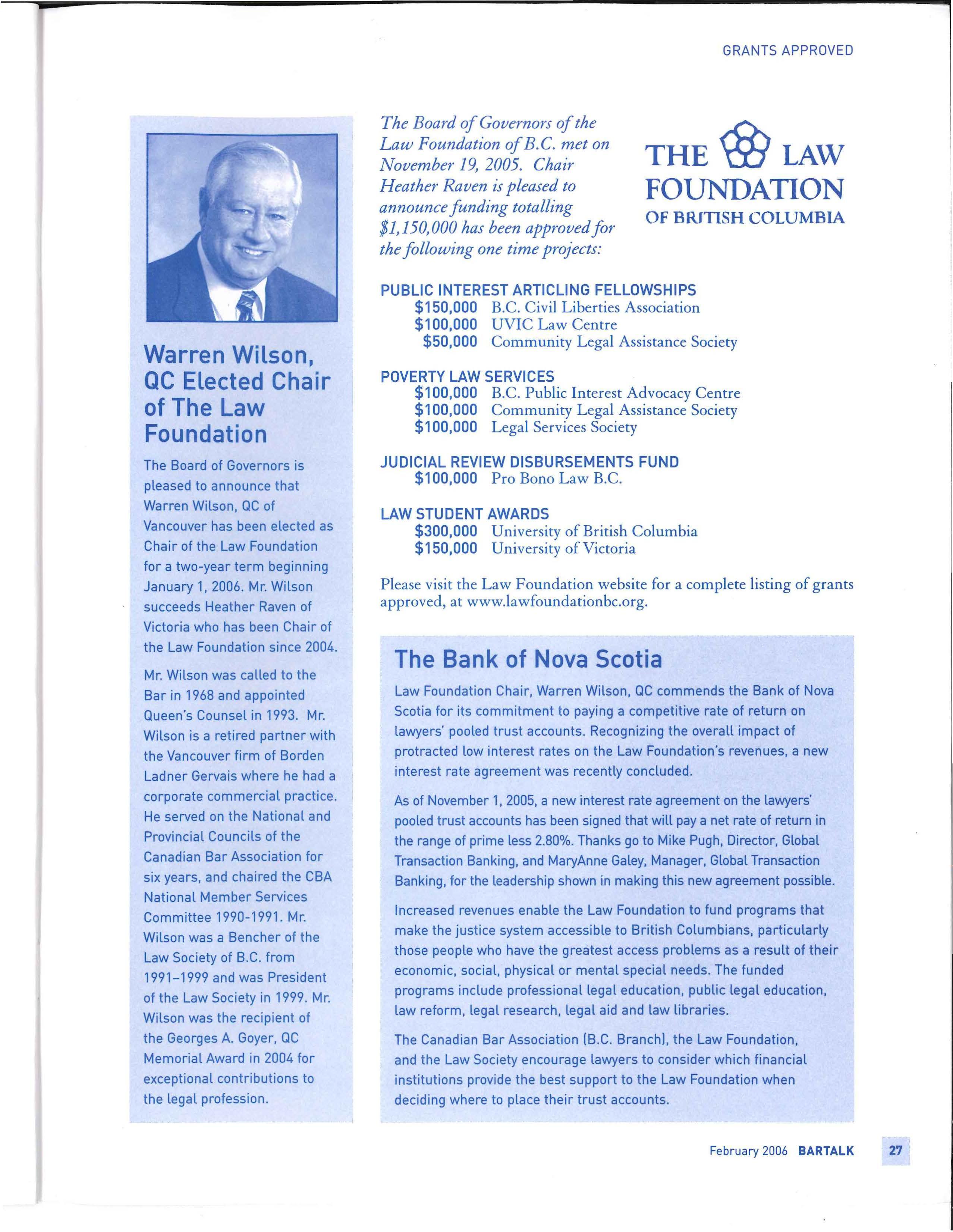 The Board of Governors is pleased to announce that Warren Wilson, QC of Vancouver has been elected as Chair of the Law Foundation for a two-year term beginning January 1, 2006. Mr. Wilson succeeds Heather Raven of Victoria who has been Chair of the Law Foundation since 2004.